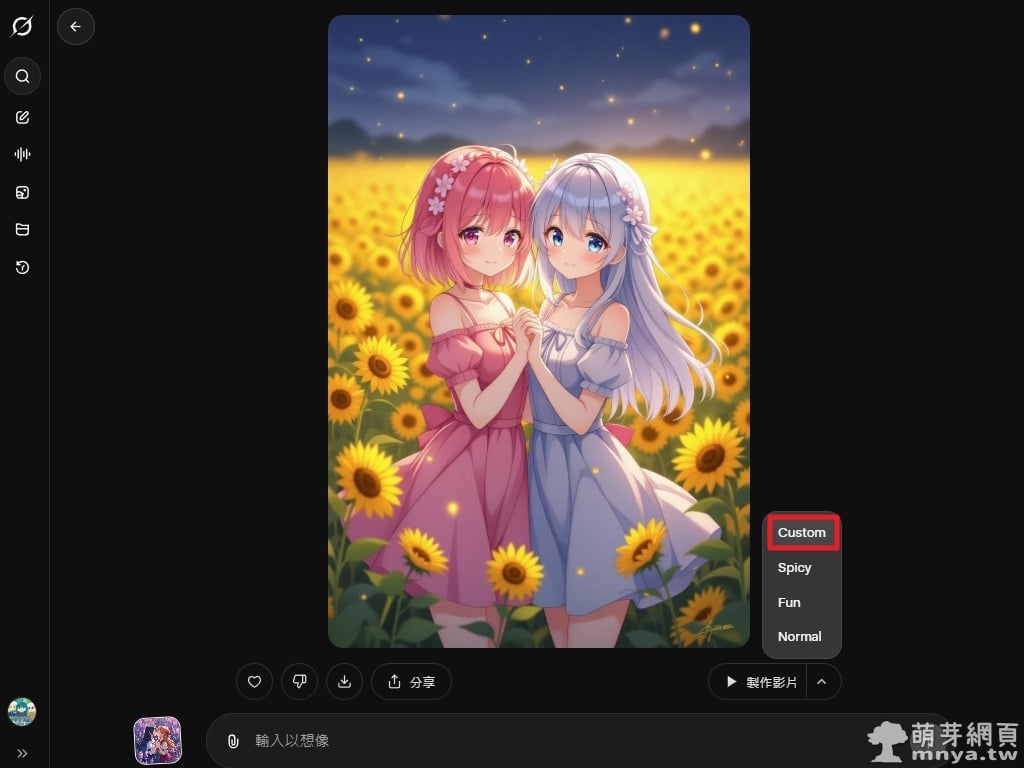 ▲ 進入選擇的影像後,來到右下方「製作影片」處選擇「Custom(自訂)」讓 AI 根據提示詞動態演繹場景。