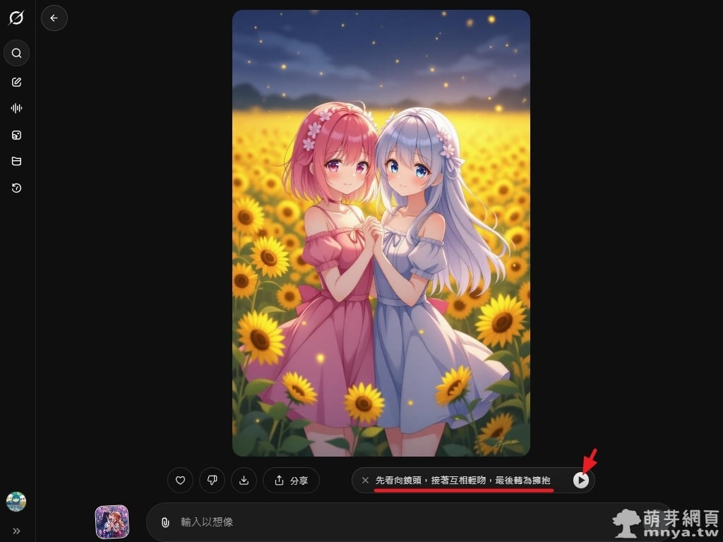 隨著 AI 影像技術的進步,現在我們不再需要繪圖板、攝影棚或後製剪輯工具,就能僅憑幾句提示詞完成一支浪漫唯美的動畫。這次我實測線上使用 Grok Imagine(使用免費帳號,無訂閱),從「無圖」開始,只靠文字描述讓 AI 自動繪出角色、場景與氛圍,接著再輸入簡單的動作描述,直接生成一段浪漫短片。Grok Imagine 最大的魅力,就在於它不僅能生成高品質的靜態影像,還能無縫接軌製作動畫。透過自然語言提示,你可以掌控場景氛圍、角色造型,甚至是鏡頭的動態流暢度。操作上只需兩個步驟: