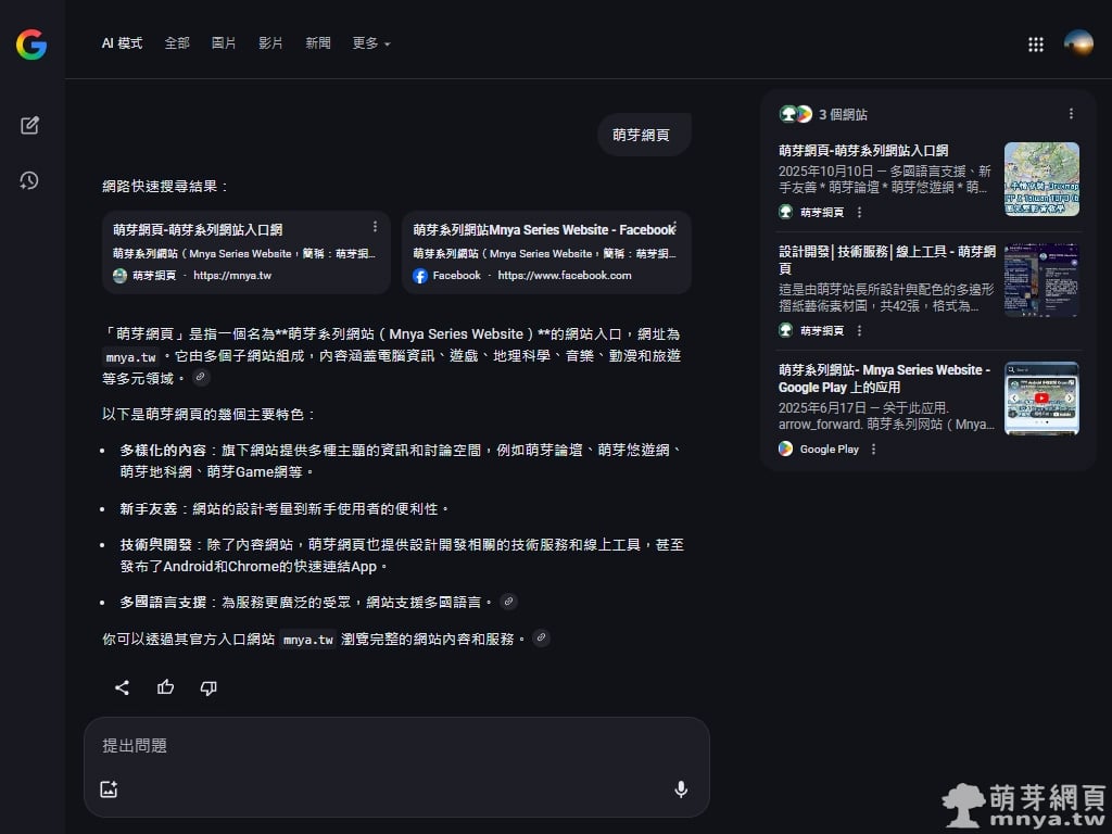 ▲ 使用 AI 模式搜尋「萌芽網頁」時,系統會在上方生成整理過的重點解答,同時保留傳統搜尋結果,資訊清楚且層次分明。