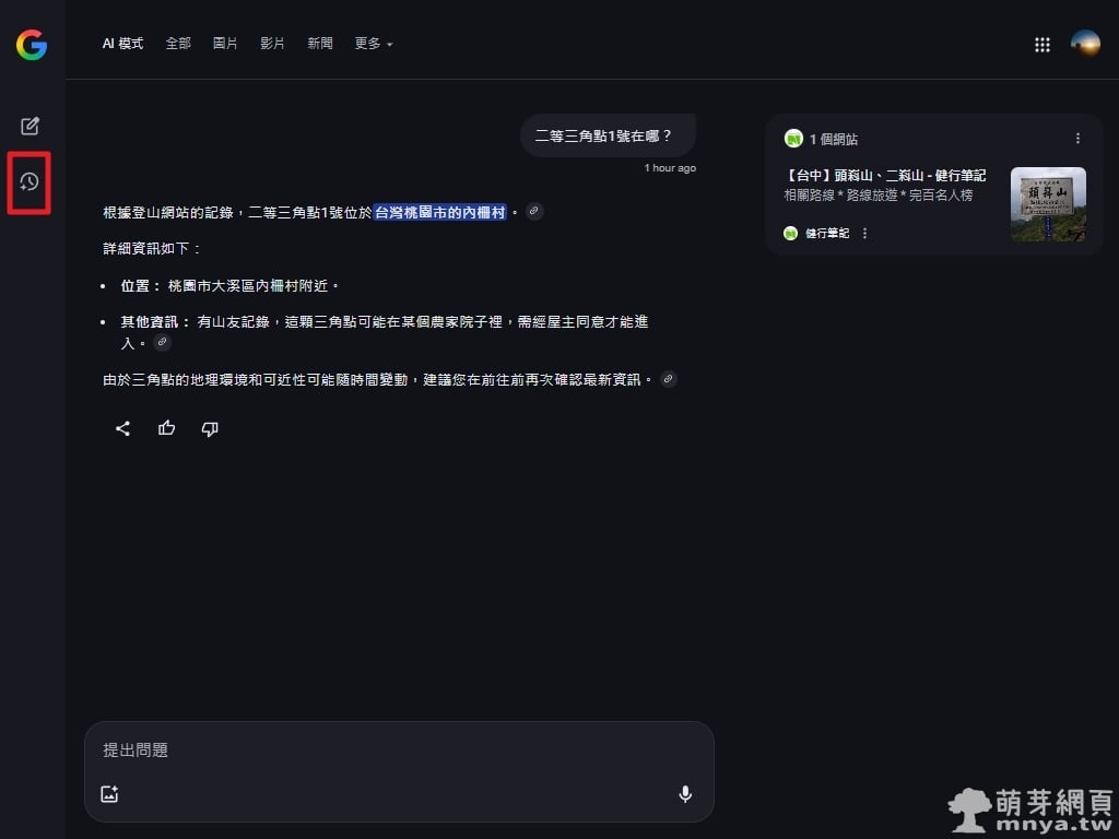 ▲ 點選左側的「AI 模式記錄」圖示,可以看到你過去詢問過的問題清單,方便回顧或再次使用相關查詢。