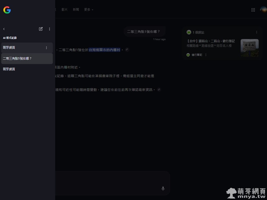 ▲ 若查詢的內容資料稀少或難以從公開來源取得,例如「二等三角點1號」,AI 模式有時會給出不完全或推測性的答案。