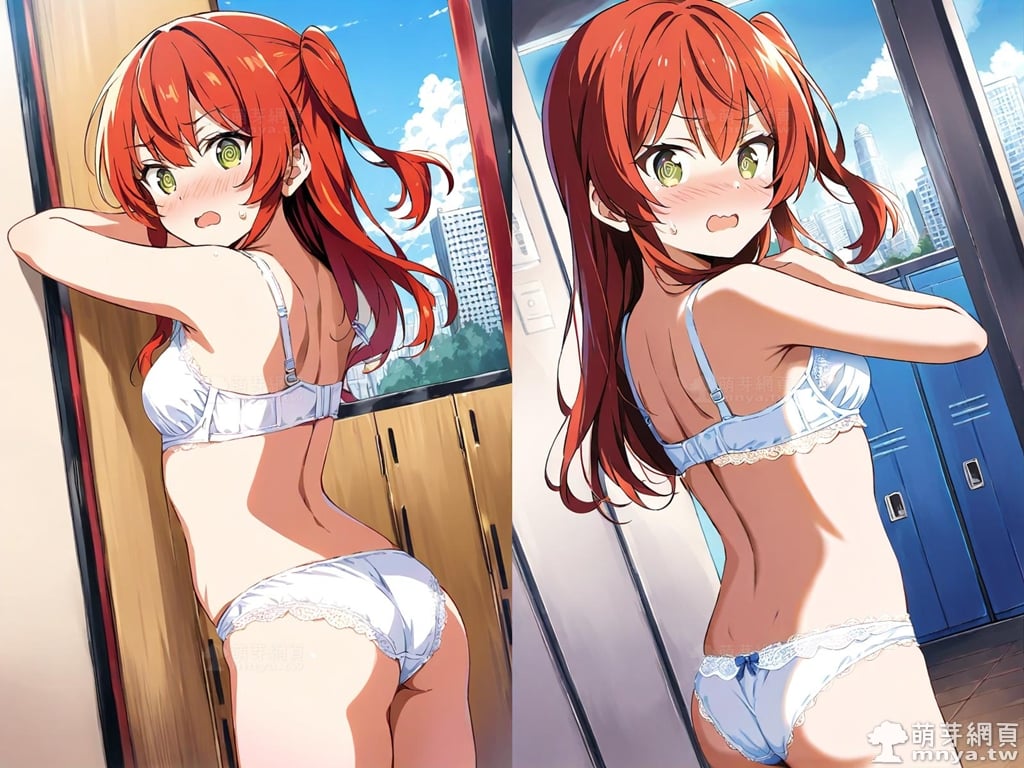 提詞文字:(masterpiece), (high quality), (high score), (great score), (year 2020), (kawaii), (loli), (photorealistic:0.1), (anime coloring), 1girl, solo, (kita ikuyo:1.2), underwear, underwear only, bra, panties, white bra, frilled bra, lace-trimmed bra, lace trim, lace, white panties, lace-trimmed panties, lingerie, ass, bare shoulders, bare arms, shoulder blades, sweat, sweatdrop, red hair, long hair, bangs, eyebrows visible through hair, hair between eyes, sidelocks, one side up, green eyes, yellow eyes, medium breasts, breasts, looking at viewer, looking back, standing, adjusting clothes, adjusting bra, undressing, hands up, surprised, embarrassed, @_@, :o, wavy mouth, blush, nose blush, v-shaped eyebrows, indoors, locker, locker room, sky, blue sky, cloud, city, building, window, day, from behind, from side, cowboy shot, dutch angle