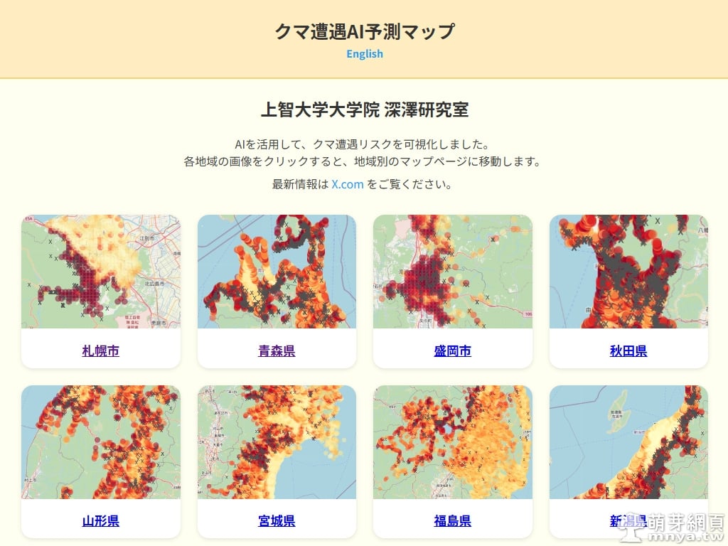 ▲ 由上智大學深澤研究室開發的「熊遭遇AI預測地圖」首頁。透過 AI 模型分析不同地區的熊出沒風險,地圖以紅、橙、黃等顏色呈現各地的危險等級,並可點選進入各縣市詳細頁面查詢。