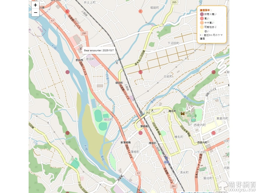 ▲ 地圖放大後可清楚看到熊出沒地點,這塊區域是沼田,前陣子才有熊跑進超市攻擊人的事件。紅色圓點顯示高風險區域,提供居民與登山者提前避開潛在危險路段的重要參考。