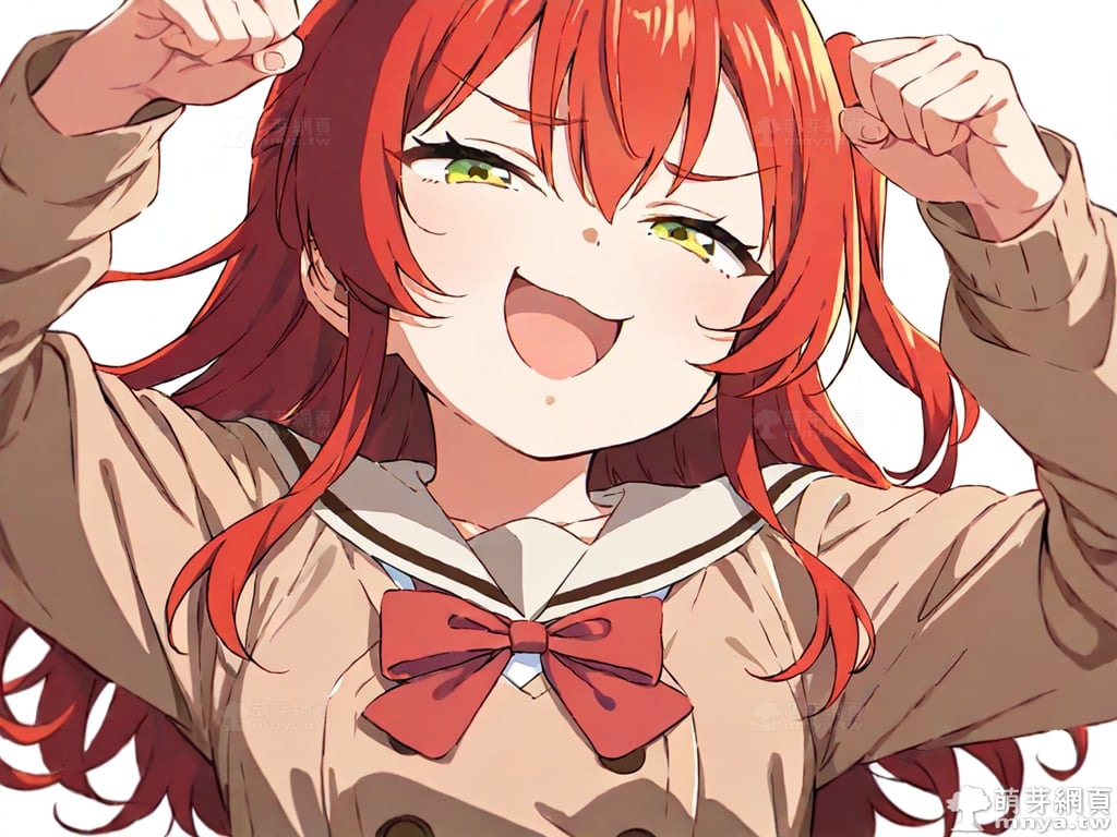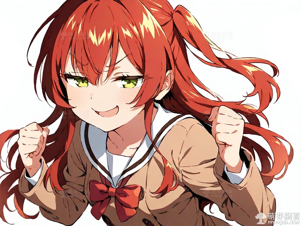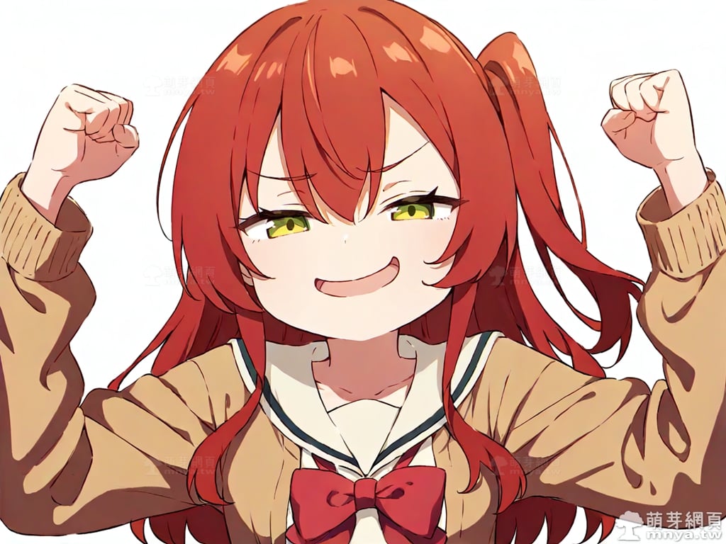 提詞文字:(masterpiece), (high quality), (high score), (great score), (year 2020), (kawaii), (loli), (photorealistic:0.1), (anime coloring), 1girl, solo, (kita ikuyo:1.2), white sailor collar, sailor collar, red bowtie, bowtie, collarbone, long sleeves, shirt, white shirt, cardigan, brown cardigan, double-breasted, buttons, red hair, long hair, bangs, eyebrows visible through hair, hair between eyes, sidelocks, one side up, green eyes, yellow eyes, medium breasts, breasts, open mouth, looking at viewer, hands up, clenched hands, standing, constricted pupils, (smug), half-closed eyes, upper body, (solo focus), (white background:1.5), (simple background:1.5), blurry