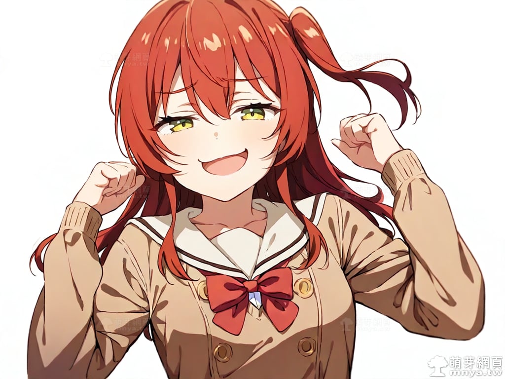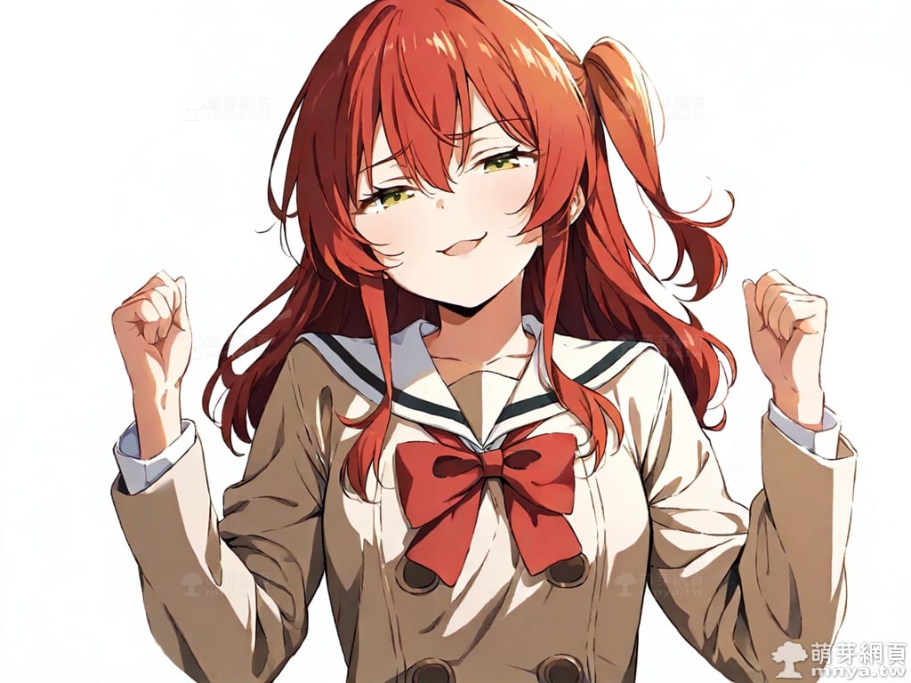 本篇示範角色為《孤獨搖滾!》中的「喜多郁代」,其服裝造型以校園制服為主,提示詞如 white sailor collar、red bowtie、brown cardigan、double-breasted、pleated skirt 皆可穩定重現她的經典外觀。髮色與髮型則使用 red hair、long hair、one side up、bangs、green eyes 以確保角色辨識度。這些服裝與髮型提示詞能讓 AI 保持角色形象一致。背景部分,本篇採用極簡構圖,提示詞如 (white background:1.5)、(simple background:1.5)、blurry、solo focus 能徹底消除雜訊干擾,突顯角色上半身與握拳動作的張力焦點。這種高權重白背景設計讓觀者的注意力完全集中在角色表情與勝利姿態上。