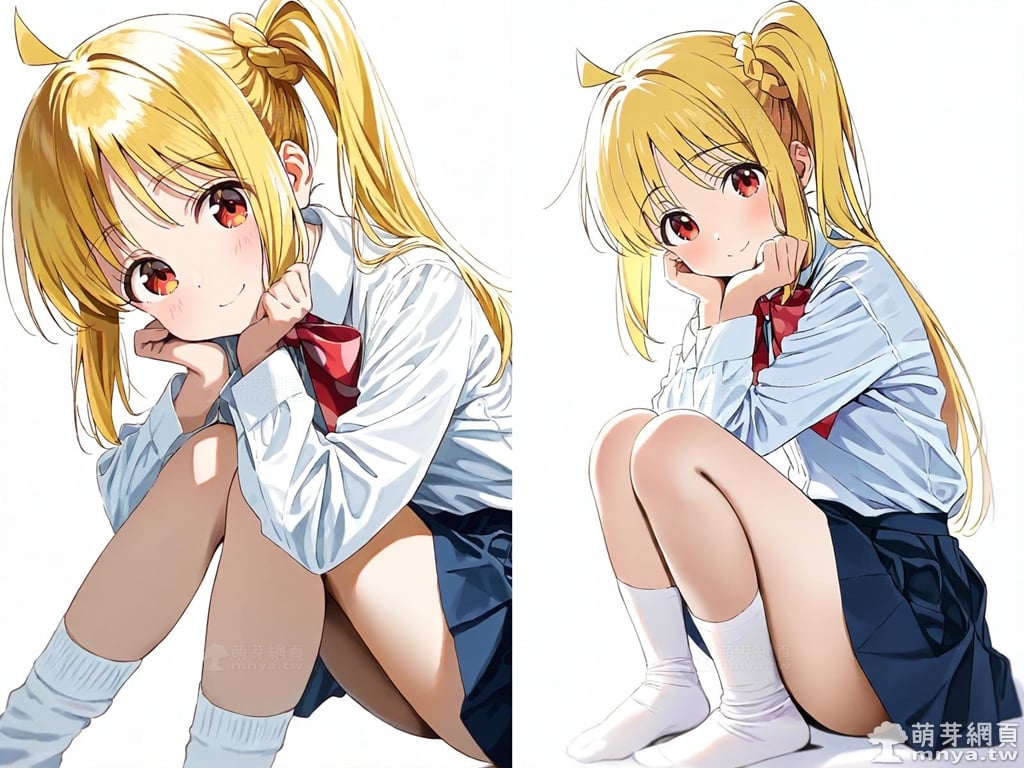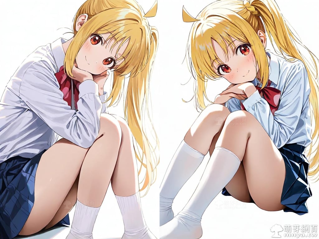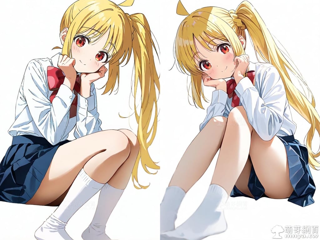 本篇示範角色為《孤獨搖滾!》的「伊地知虹夏」,其制服造型以經典校園風為主,提示詞如 red bowtie、collared shirt、white shirt、long sleeves、blue skirt、grey skirt、pleated skirt 能穩定重現她那活力卻帶點俏皮的日常穿搭。髮型與特徵則使用 long hair、blonde hair、side ponytail、ahoge、sidelocks、red eyes 確保角色辨識度滿分。腳部細節加入 white socks、no shoes 強調居家或室內的輕鬆感,thighs 則適度突出側坐時的腿部曲線。背景堅持極簡,(white background:1.5)、(simple background:1.5)、blurry 能讓觀者視線完全聚焦在角色柔軟的表情與托腮動作上,達到最大化的純粹可愛效果。
