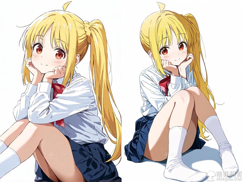 提詞文字:(masterpiece), (high quality), (high score), (great score), (year 2020), (kawaii), (loli), (photorealistic:0.1), (anime coloring), 1girl, solo, (ijichi nijika:1.2), bocchi the rock!, long hair, blonde hair, side ponytail, ahoge, sidelocks, red eyes, red bowtie, bowtie, collared shirt, blue skirt, grey skirt, long sleeves, pleated skirt, shirt, skirt, white shirt, small breasts, breasts, sitting, looking at viewer, smile, blush, closed mouth, head rest, hands up, knees up, head tilt, hands on own cheeks, knees together feet apart, hands on own face, hands on own chin, own hands together, white socks, socks, no shoes, thighs, from side, (white background:1.5), (simple background:1.5), blurry