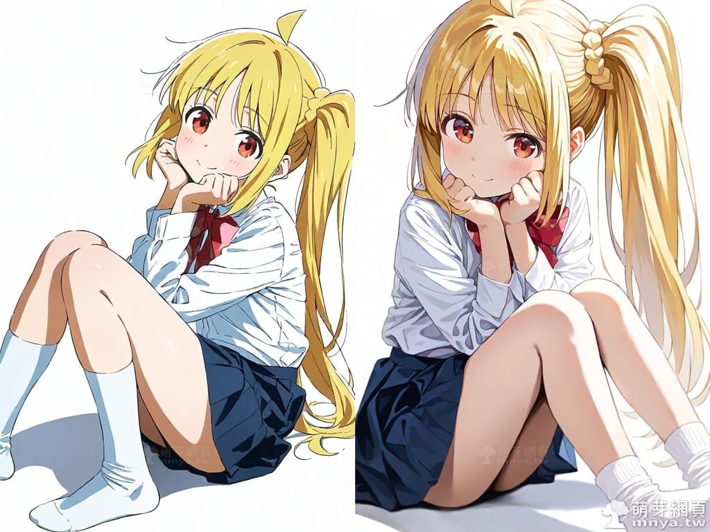 在本次示範中,設定伊地知虹夏脫下鞋子、穿著白襪側坐在純白背景上,雙手輕托腮幫、膝蓋併攏腳尖自然分開,微微側頭望向觀者。金色側馬尾與呆毛在柔光下輕輕晃動,紅色蝴蝶結與藍灰色百褶裙完美還原角色經典造型。表情帶著招牌陽光笑容,臉頰泛起淡淡紅暈,眼神像是在說「怎麼突然看過來啦~」卻又藏不住開心。透過側面視角,畫面呈現出滿滿的日常療癒感。共生成 50 張,挑選 12 張坐姿最自然、托腮最可愛且瑕疵較少的版本作為最終參考。