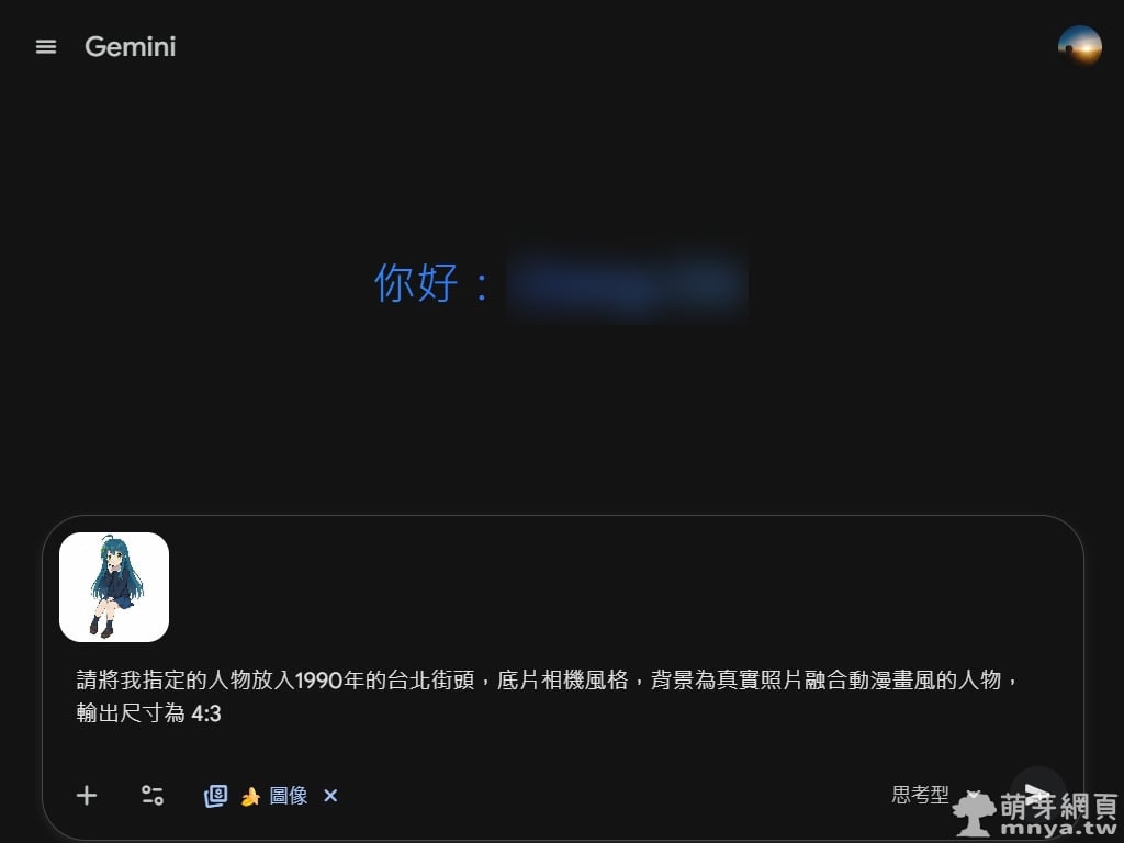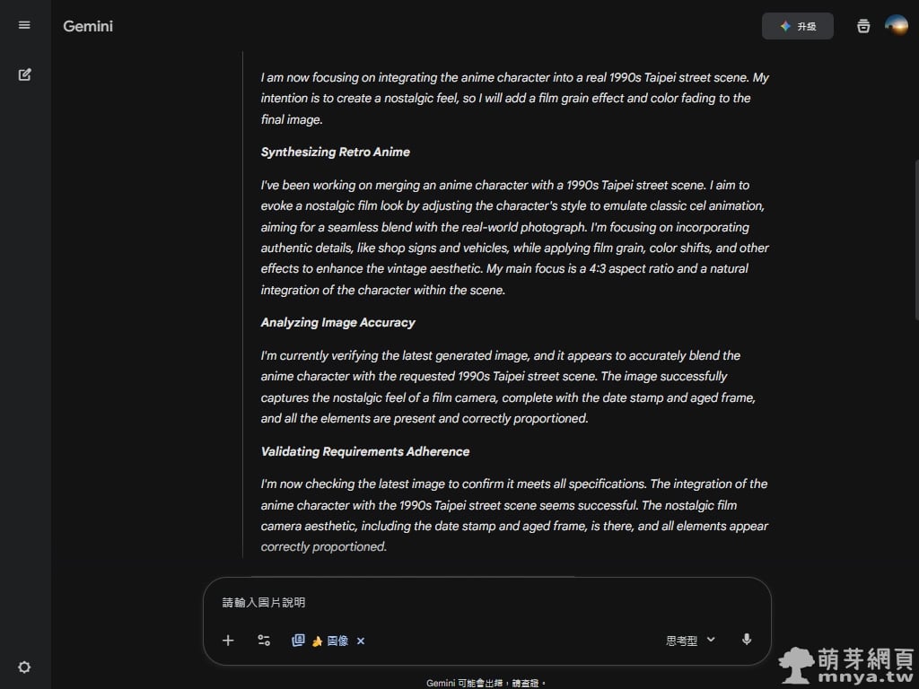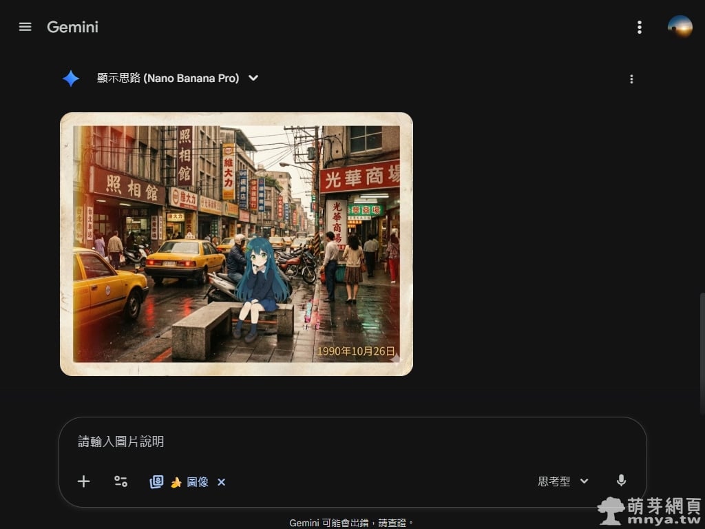 ▲ 在 Gemini 介面中上傳圖片指定參考角色,這邊以本站板娘萌芽娘作為主角,再來輸入完整的中文提示,描述主角、場景年代、城市位置、相片比例與底片機質感等要求,只靠參考圖與幾行中文就能把腦中的畫面清楚交給 Nano Banana Pro。