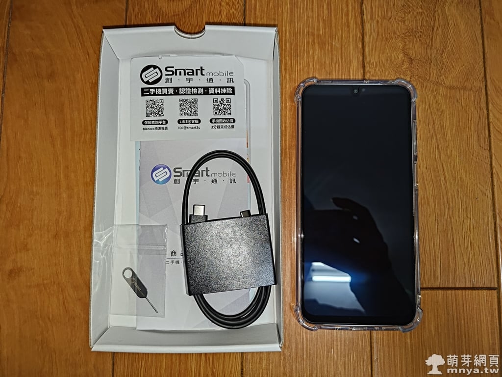 ▲ 盒內配件包含充電線、退卡針與簡易說明,擺放整齊乾淨;手機本體由店家先裝上空壓殼,開箱後即可直接使用。