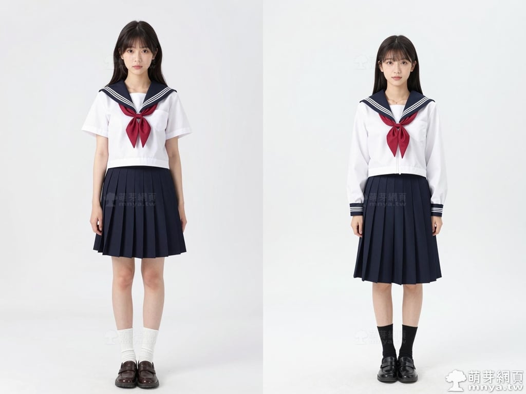 經典的海軍藍水手服,搭配紅色領結與短裙,展現純真學生氣質,是最受歡迎的校服造型。
