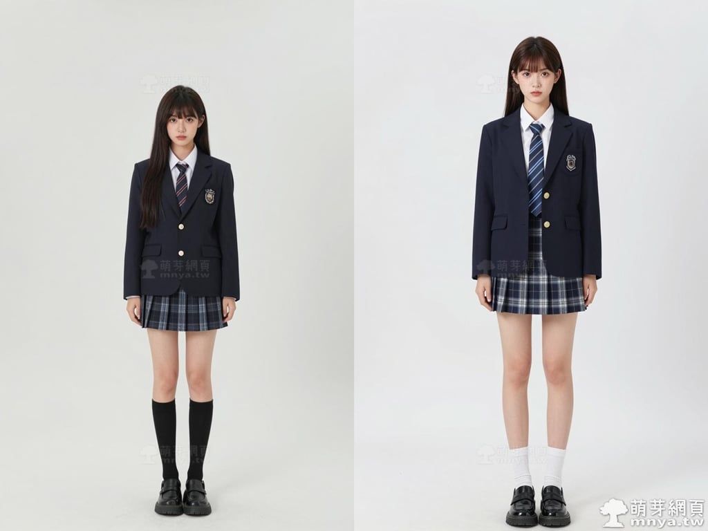 時尚的西裝外套搭配格子裙與領帶,呈現現代高中生的幹練與優雅風貌。