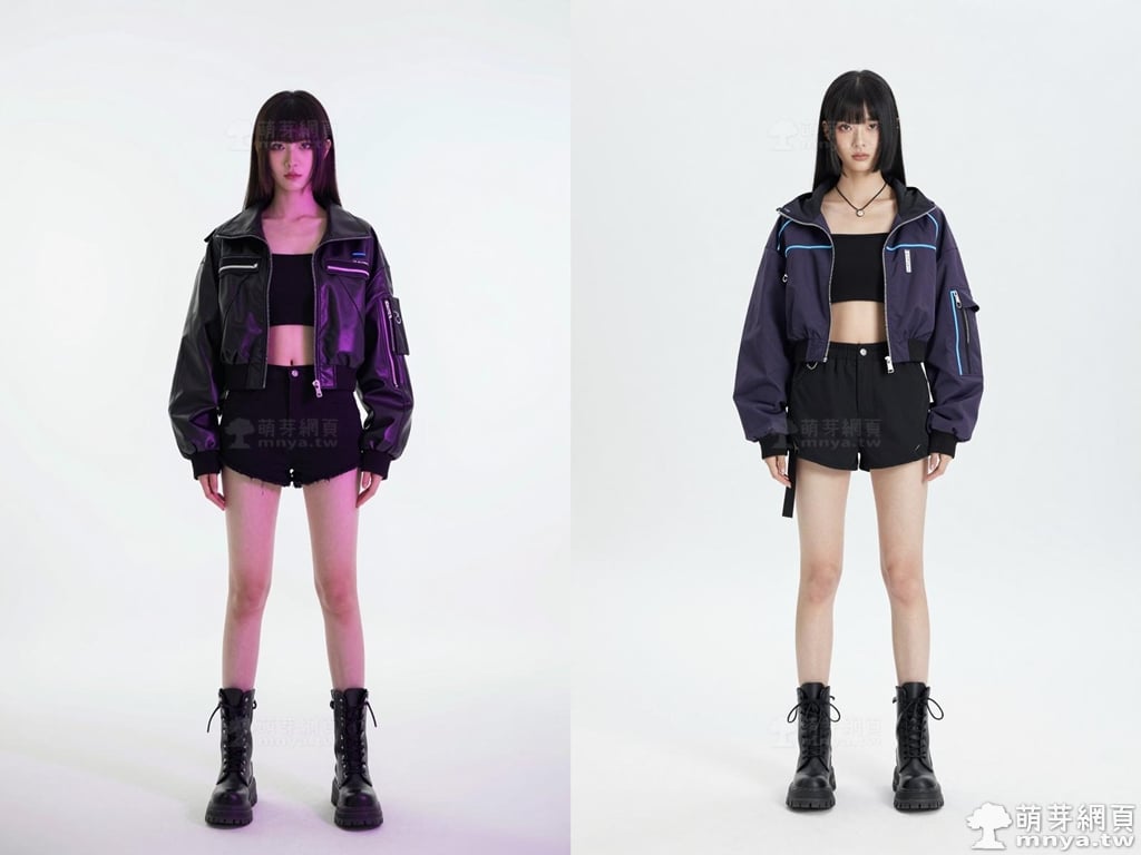 螢光霓虹外套搭配短褲與高筒靴,展現未來都市的酷炫潮流。