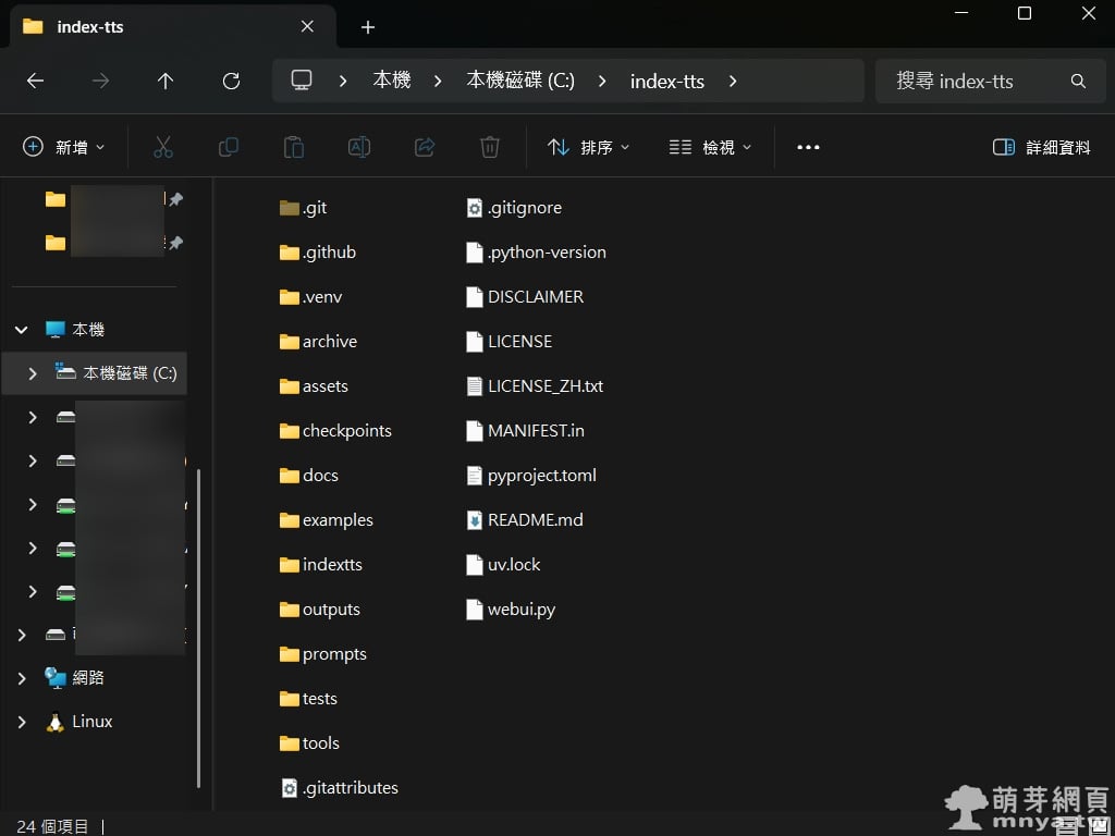 完成後,專案目錄中應可看到 checkpoints、indextts 資料夾,以及 webui.py 與 pyproject.toml 等檔案。