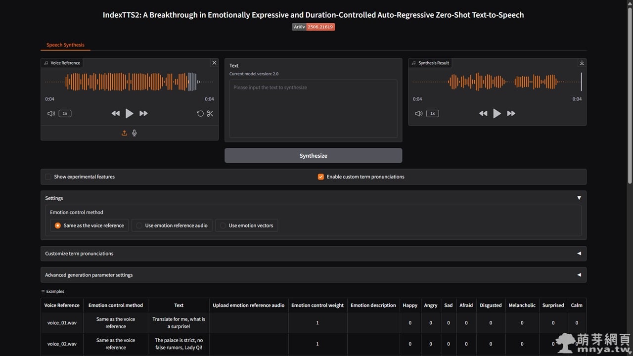 啟動 WebUI 後,瀏覽器會開啟 IndexTTS-2 的主頁面,整體介面是以 Gradio 為基礎設計,所有操作皆集中在「Speech Synthesis」頁籤中完成。最基本的使用流程,是先在左側上傳一段「Voice Reference」作為聲音參考來源,這段音檔將決定生成語音的音色與說話者特徵。IndexTTS-2 採用零樣本語音複製設計,因此不需要事先訓練,只要一段清楚、語者單一的音檔,即可有效還原目標聲線。建議長度約為 8 秒至 15 秒,實測效果最佳。