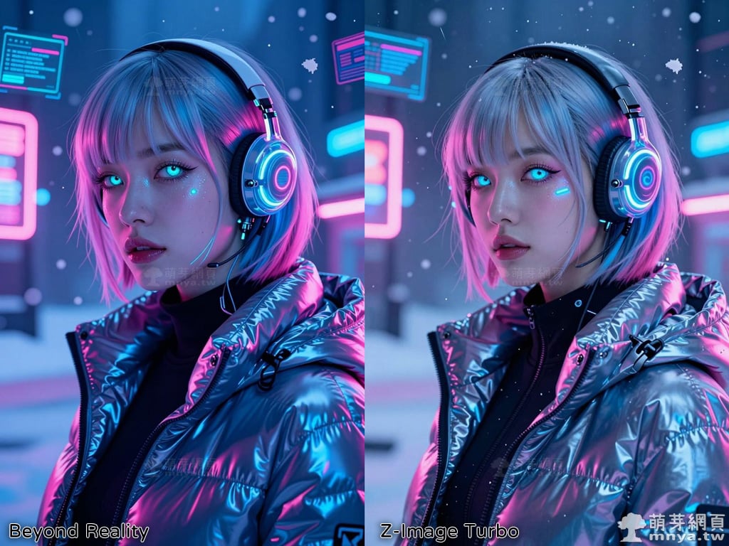 ▲ 對照組(三),提示詞:雪地中的賽博朋克未來女性,超近距離肖像,霓虹發光妝容,cyberpunk風格,發光瞳孔,銀色或粉藍短髮,透明科技感耳機與頸部植入物,穿高科技羽絨外套+反光材質,背景雪景混雜全息投影與霓虹招牌,強烈冷藍+粉紫+霓虹對比光,未來感強烈,超細節皮膚紋理,8k寫實,cyberpunk aesthetic,電影級光效。