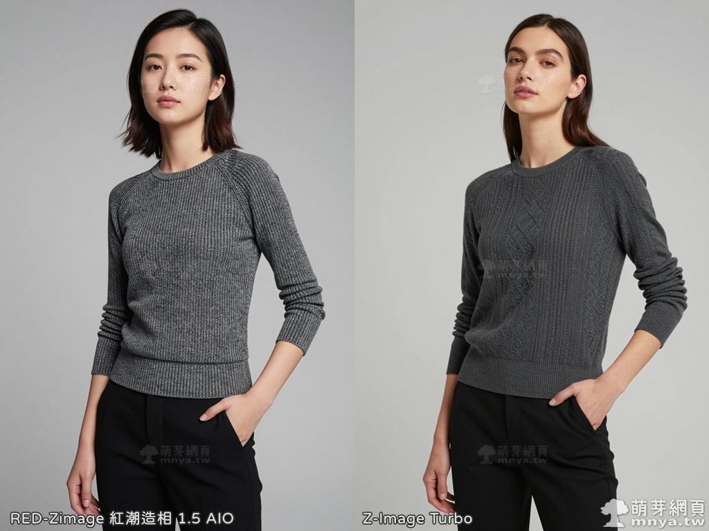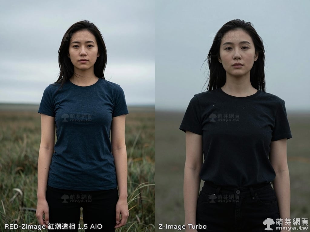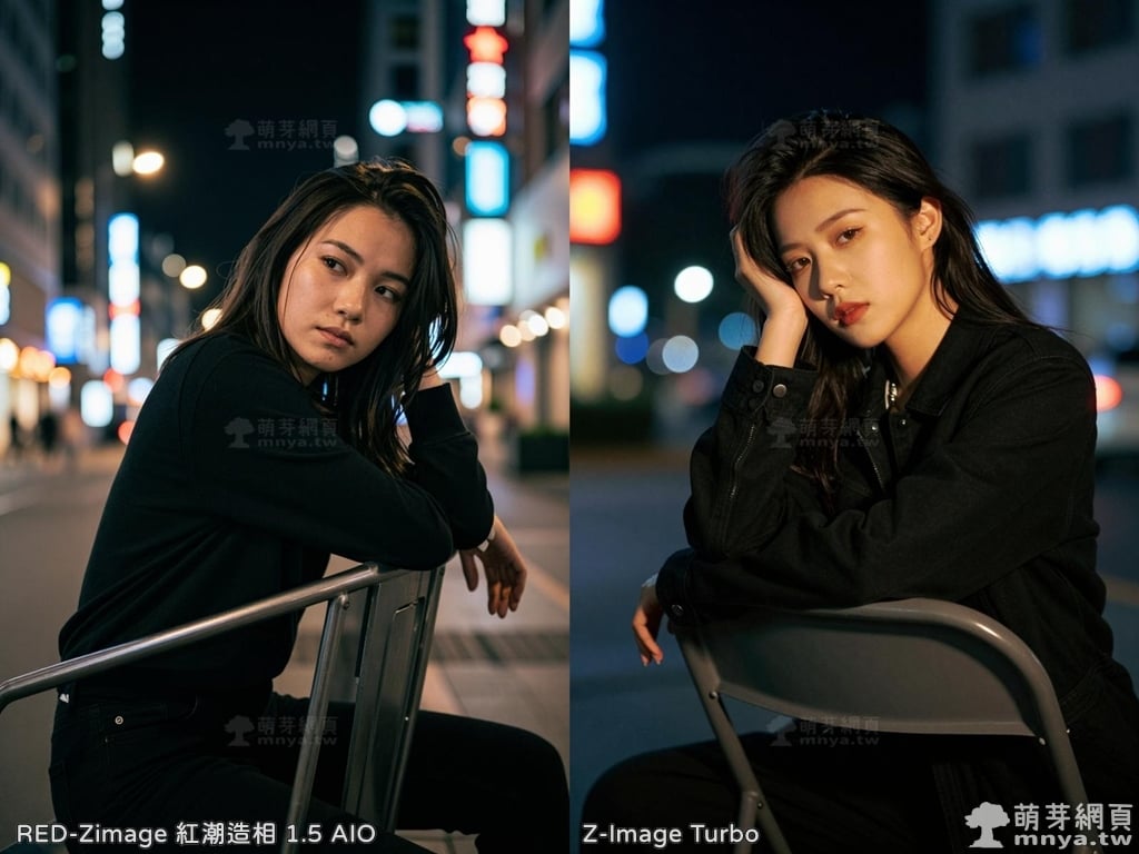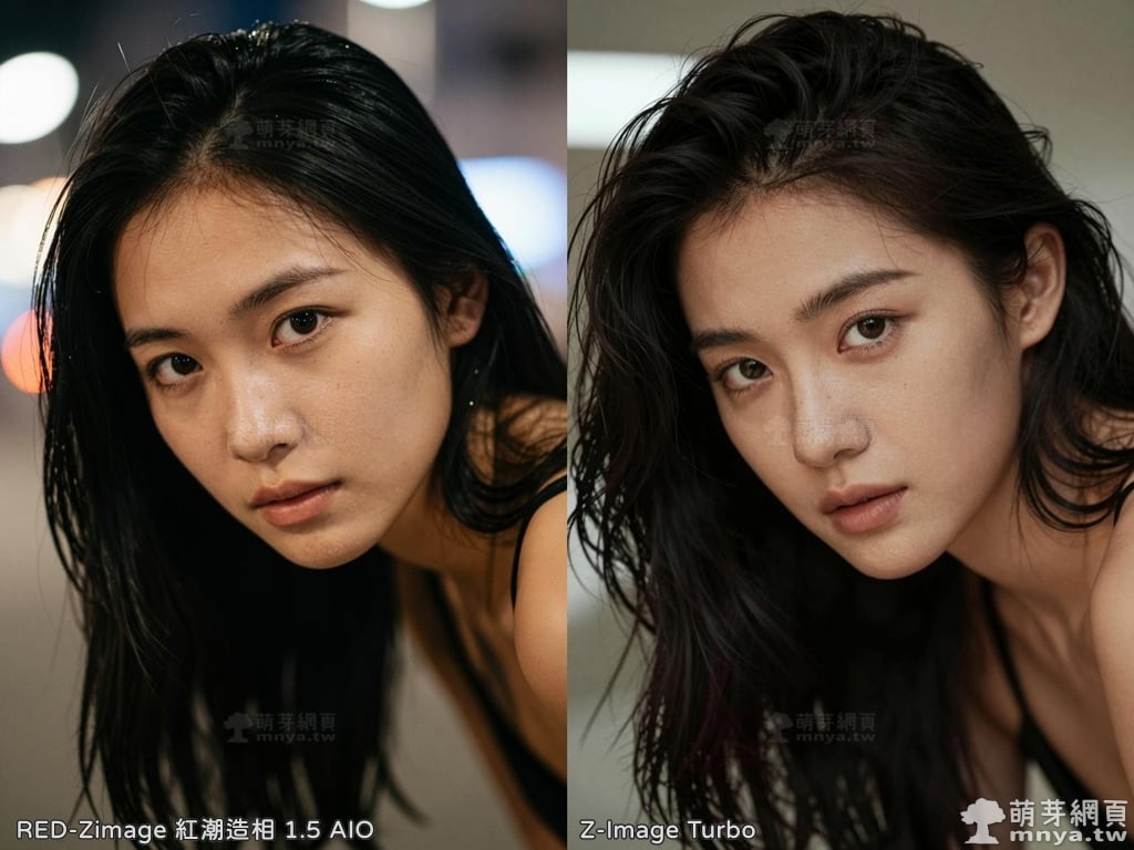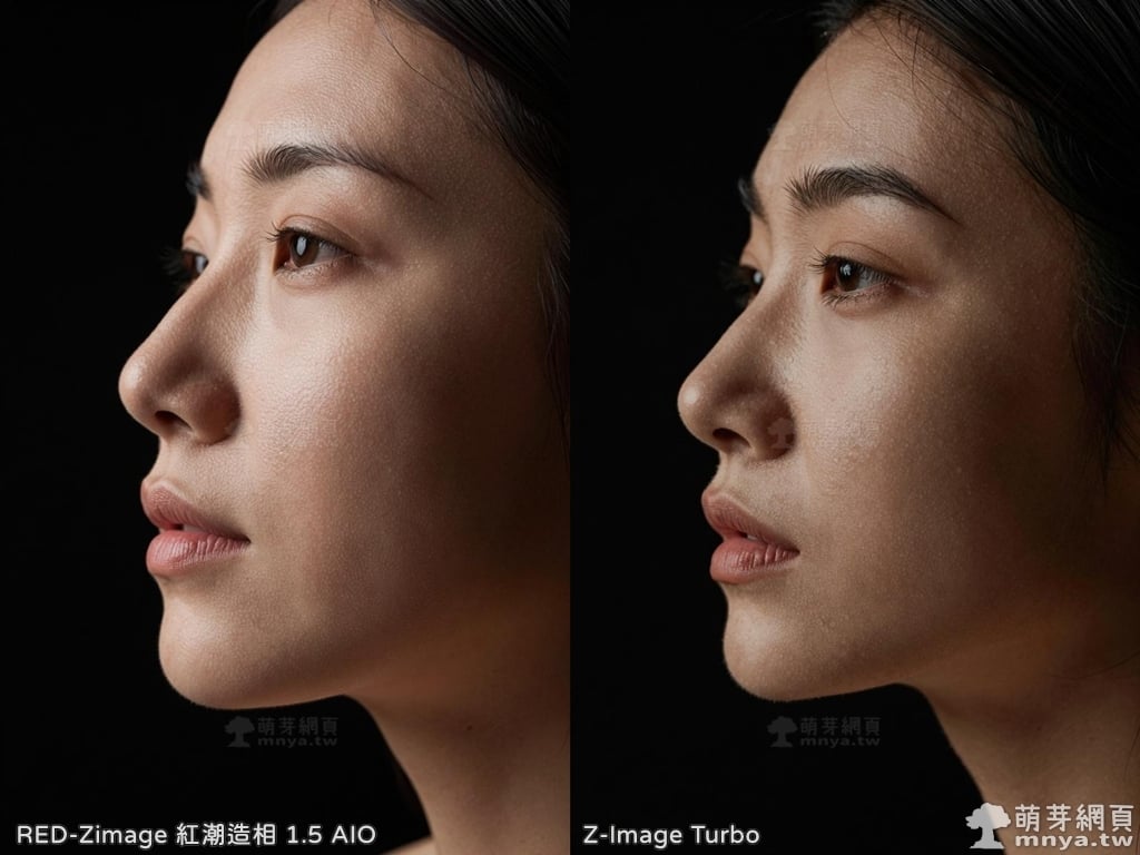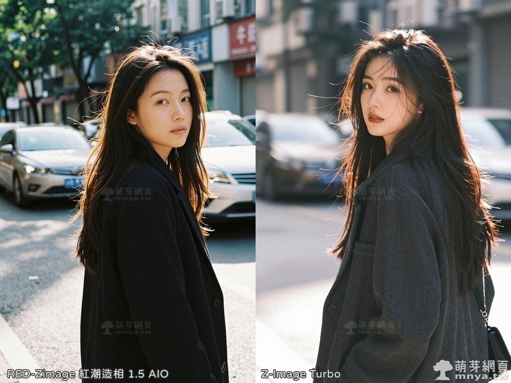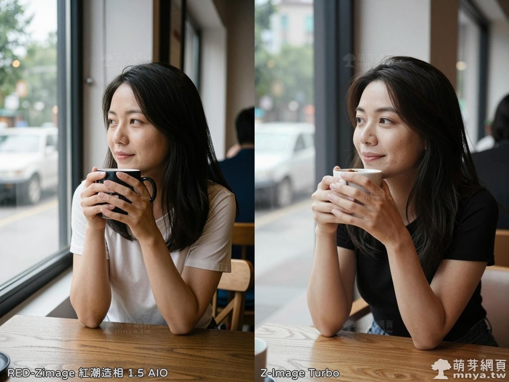 結合這十組圖像的實際觀察,可以補充一個相當關鍵的差異:RED-Zimage 紅潮造相 1.5 AIO 明顯更傾向輸出亞洲面孔特徵,臉型比例、五官結構與膚質呈現更貼近日常現實狀態,整體觀感偏向素顏或淡妝的人像攝影,而非刻意修飾的商業美感。同時,其光影處理較為自然克制,陰影過渡柔和,畫面更像真實環境光下拍攝的照片;相較之下,Z-Image Turbo 的人臉風格則較為泛用,帶有一定國際化與標準化傾向。這也說明紅潮造相在人像題材上,並非單純強化銳利度,而是朝向「更像真實亞洲人像攝影」的方向微調。