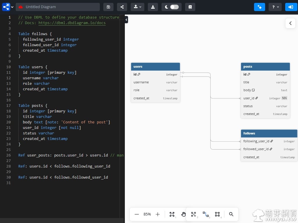 ▲ 這是 dbdiagram.io 的標準作業介面。左側為 DBML 代碼編輯區域,使用者可以在此撰寫資料庫結構;右側則是即時生成的 ER 圖。圖中展示了 users、posts 與 follows 等資料表(這是預設的範例),透過簡潔的語法即可定義主鍵、欄位類型及表與表之間的關聯,實現「所見即所得」的高效率體驗。