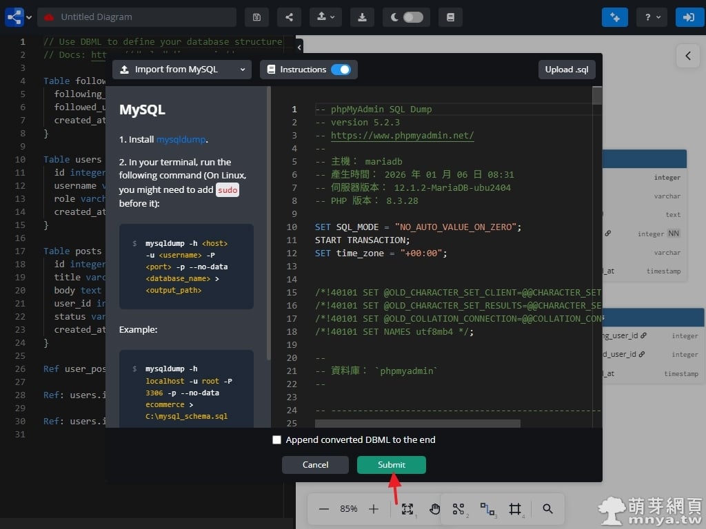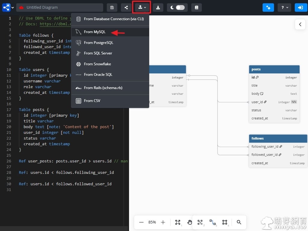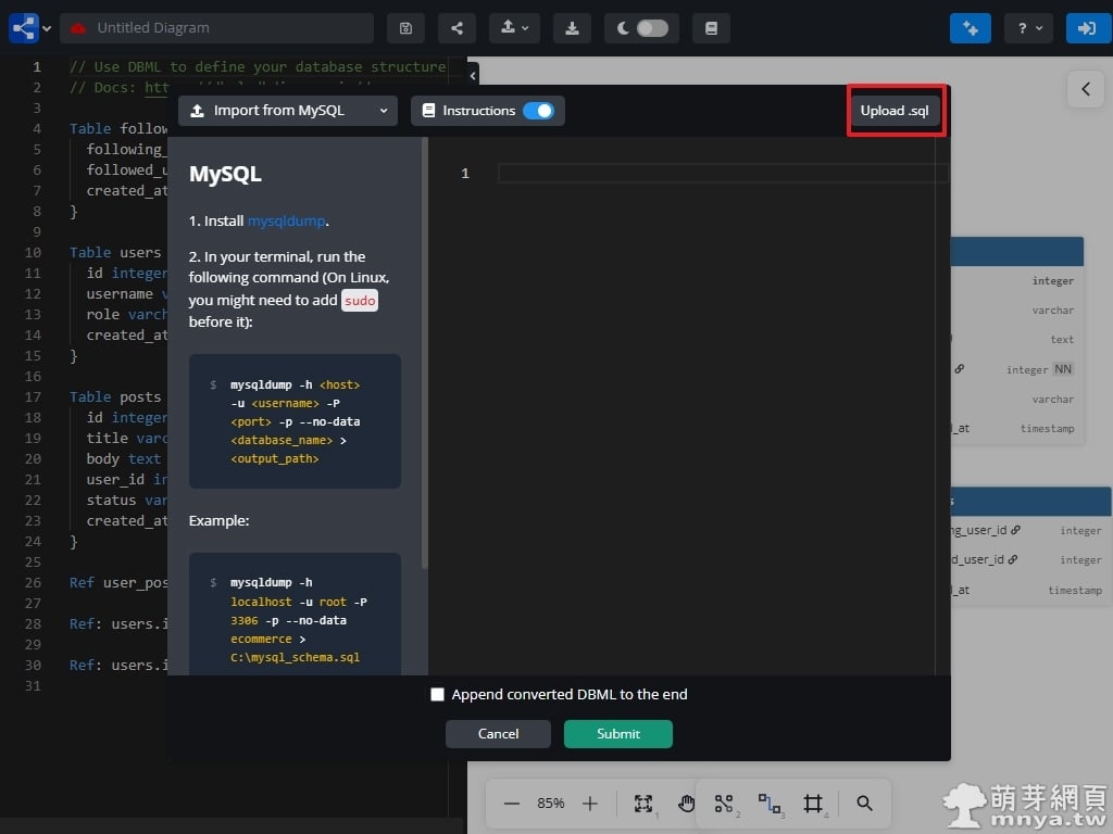 ▲ 在選擇匯入來源後(以 MySQL 為例),系統會跳出一個專屬對話框。使用者可以直接將從資料庫匯出的 .sql 檔案拖曳上傳,或是直接貼上 SQL 建表語句。平台會自動解析這些 SQL 指令並將其轉換為 DBML 格式,省去了手動逐一輸入欄位與關聯的繁瑣步驟。