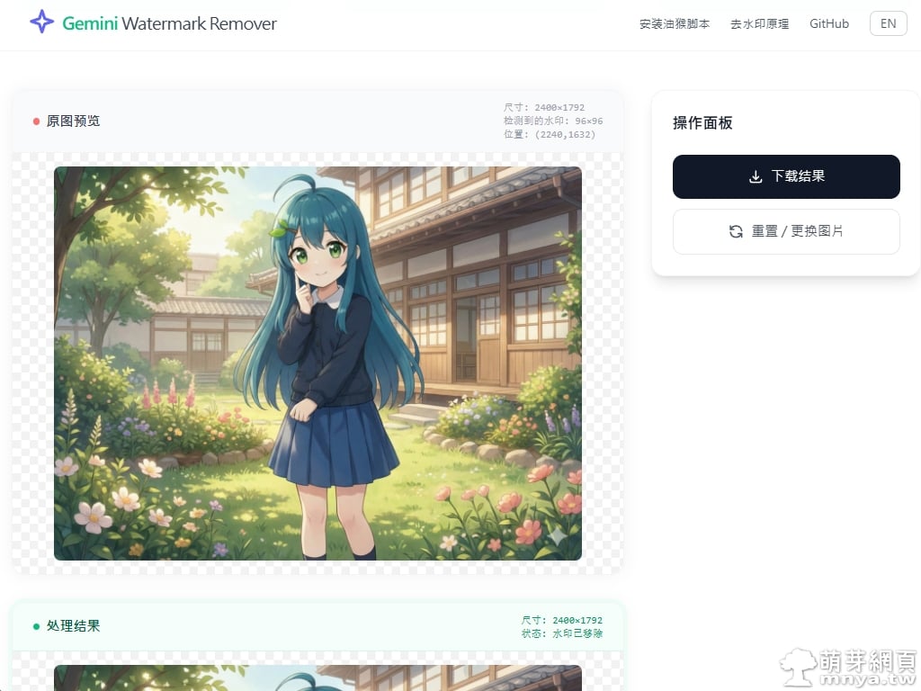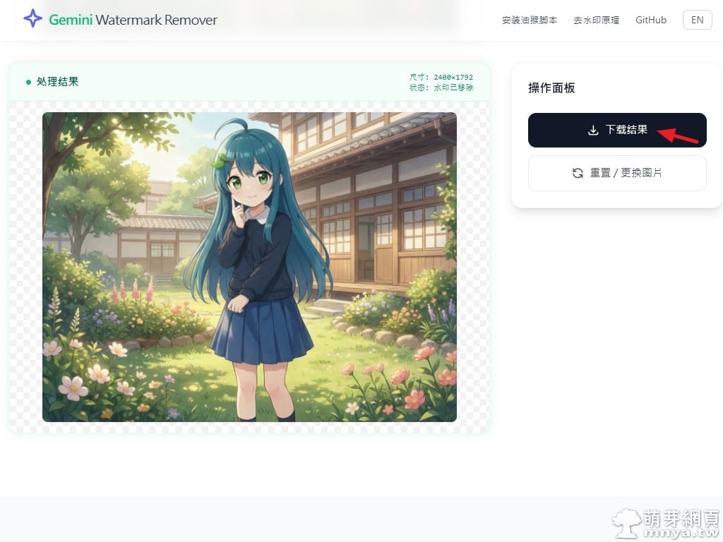 ▲ 這是處理結果的部分,使用者可以透過右側的操作面板點擊「下載結果」按鈕。由於採用反向混合演算法,輸出的影像能保持原始像素的清晰度,完全不會有傳統修圖軟體產生的模糊感。