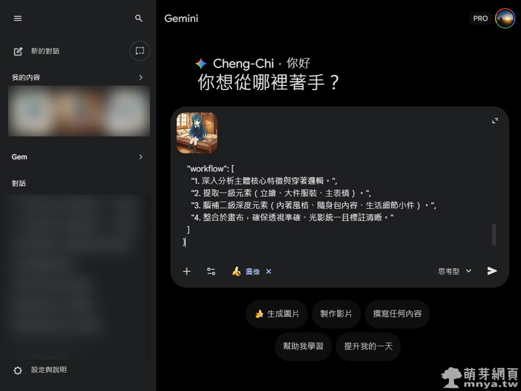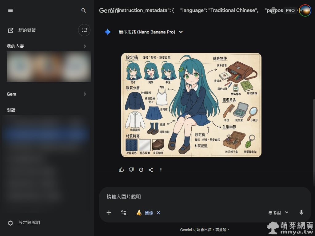 ▲ 進入 Gemini 介面中輸入剛剛的 JSON 提示詞,利用 JSON 格式精確定義了「頂尖角色設計師」的角色設定,並詳細列出「全景式角色深度概念分解圖」的任務目標與工作流。透過選擇最新的思考型模型(Gemini 3 Pro),系統能深度解析這些邏輯指令。請記得點「生成圖片」的按鈕將 Nano Banana Pro 工具指定進來。