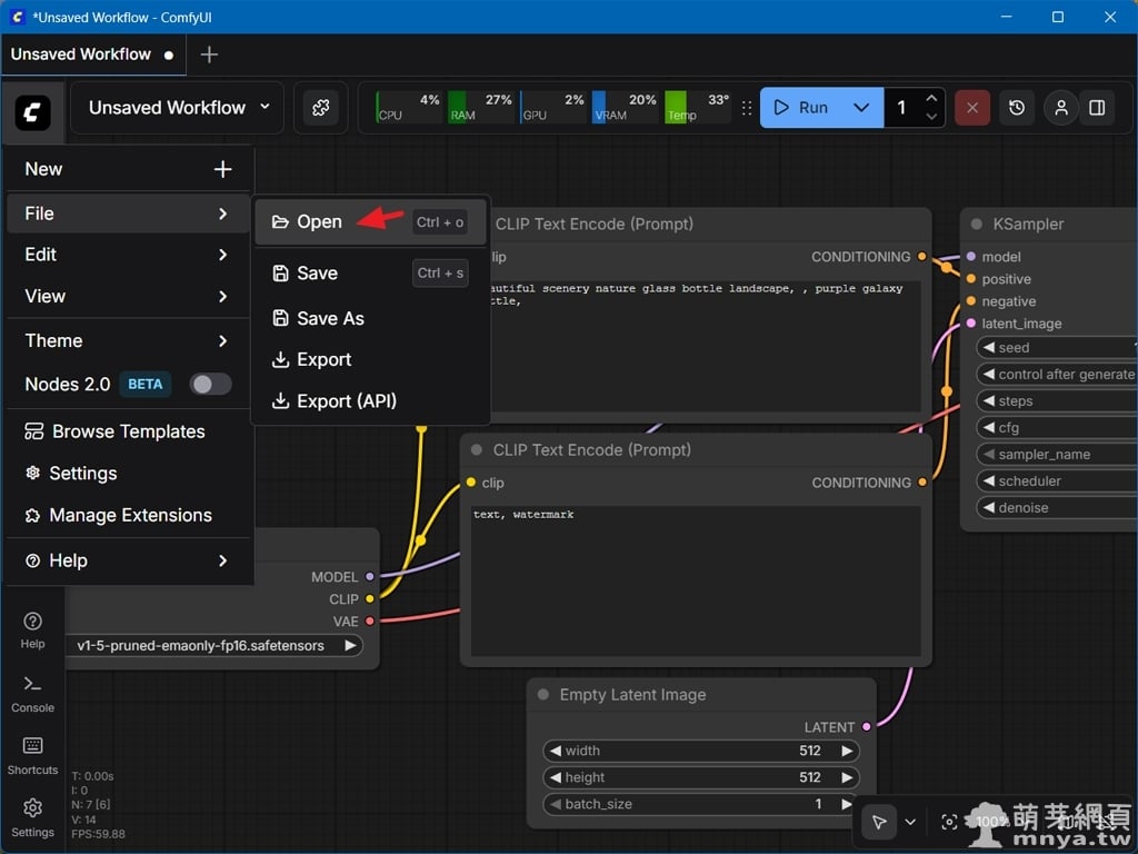 ▲ 首先在 ComfyUI 中啟動工作流。點擊 LOGO 選單的「File」並選擇「Open」,我們可以載入官方提供的 LTX-2 之 I2V 工作流 JSON 檔案(直接下載點 / 來源網址)。