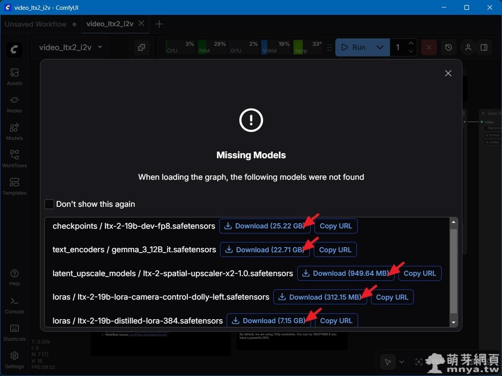 ▲ 如果您的環境中缺少對應的模型權重,系統會彈出「Missing Models」提示。LTX-2 包含主權重(Checkpoints)、Text Encoder(如 Gemma 3)以及相關的 Upscaler 元件等。您可以直接點擊下載或複製 URL 手動下載至對應資料夾中。