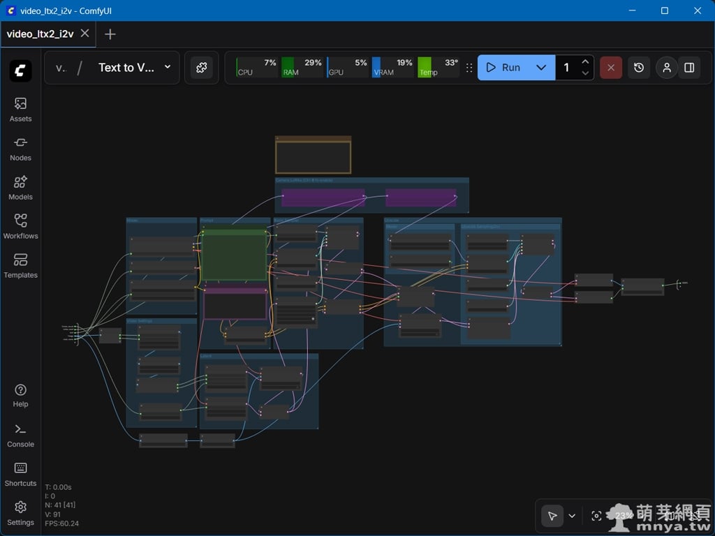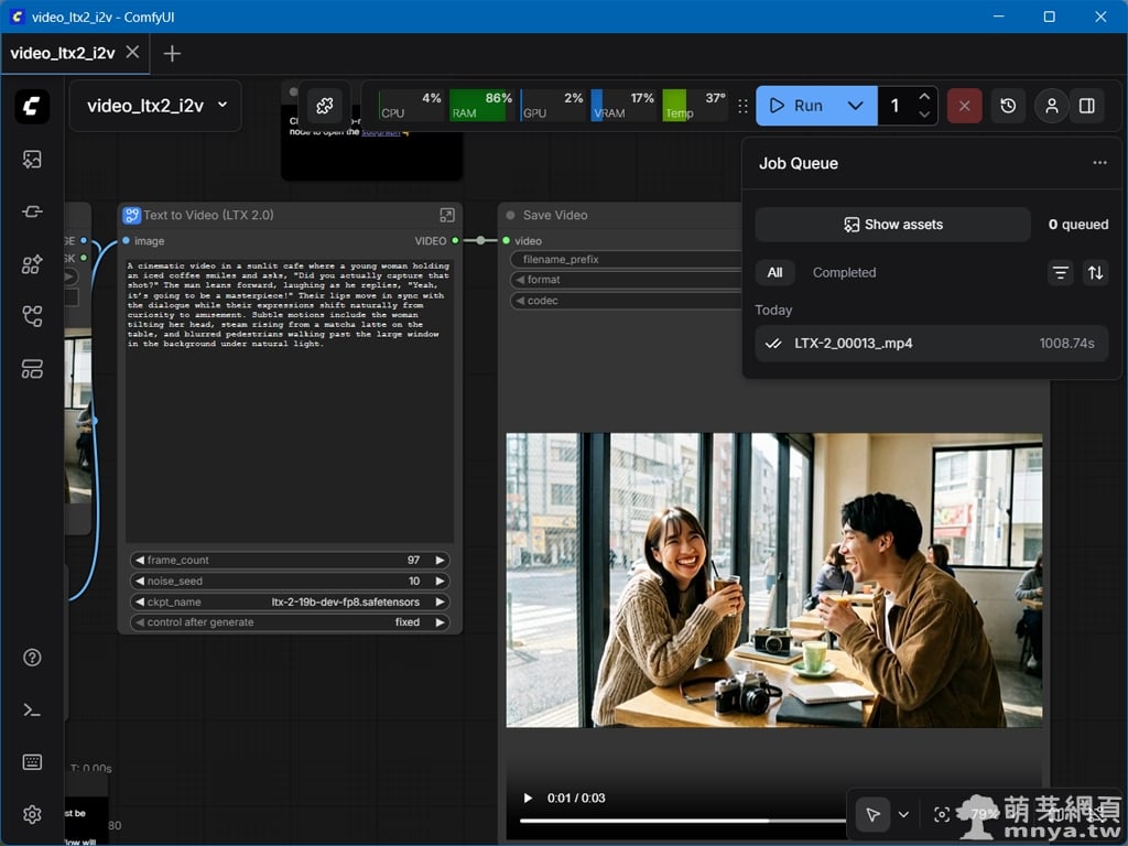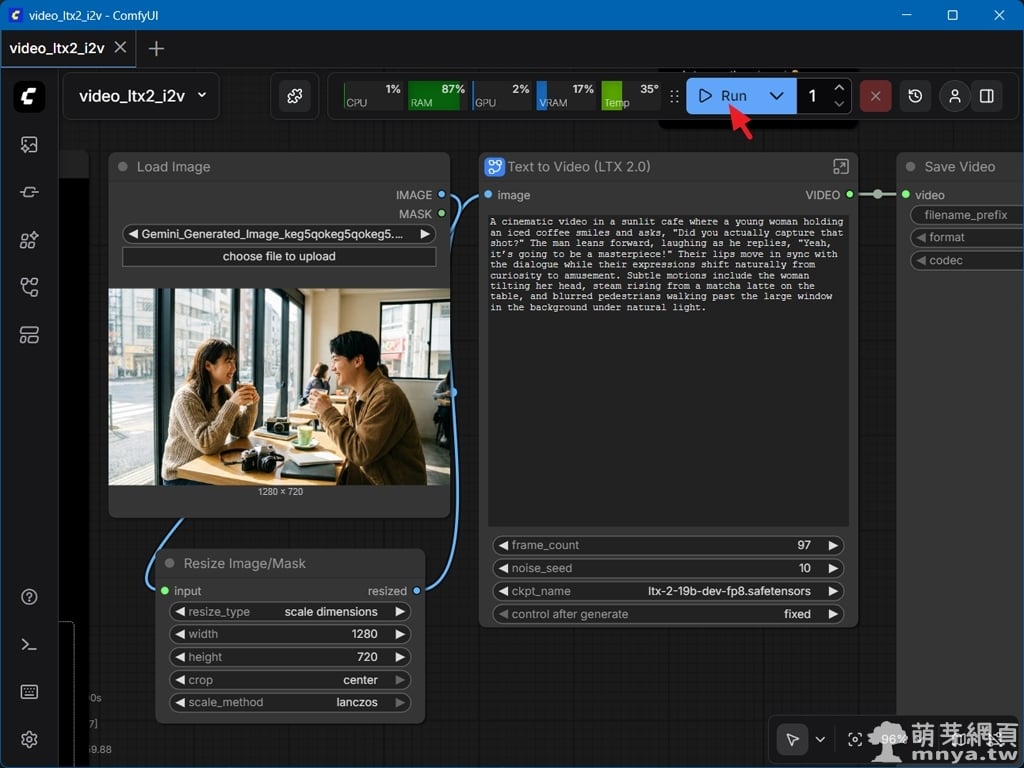 ▲ 進入本次 I2V 實測核心。我們載入先前用 AI 生成的咖啡廳對話照片,並將自定義的敘述及對話腳本填入文字節點中。模型會讀取圖片的人物特徵,並結合文字內容來模擬嘴型與面部表情。設定完成後,點擊上方藍色的「Run」按鈕即可開始生成。以此次的設置為 1280 x 720 且共 97 幀下幾乎已經到我的硬體極限(RTX 5070 Ti 16 GB VRAM + 64 GB RAM),再增加一點幀數可能都會爆 VRAM。