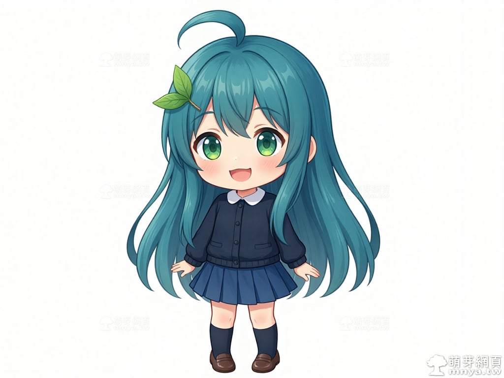 ▲ 這是使用「開心」表情提示詞生成的萌芽娘全身 Q 版圖。透過將 (chibi:2) 與 (full body shot:2) 的權重拉高,模型精準呈現了五短身材的可愛比例。在專屬 LoRA 模型的加持下,萌芽娘標誌性的青藍色長髮、頭頂的葉片髮飾以及呆毛特徵都被完美還原,展現出充滿朝氣的神情。