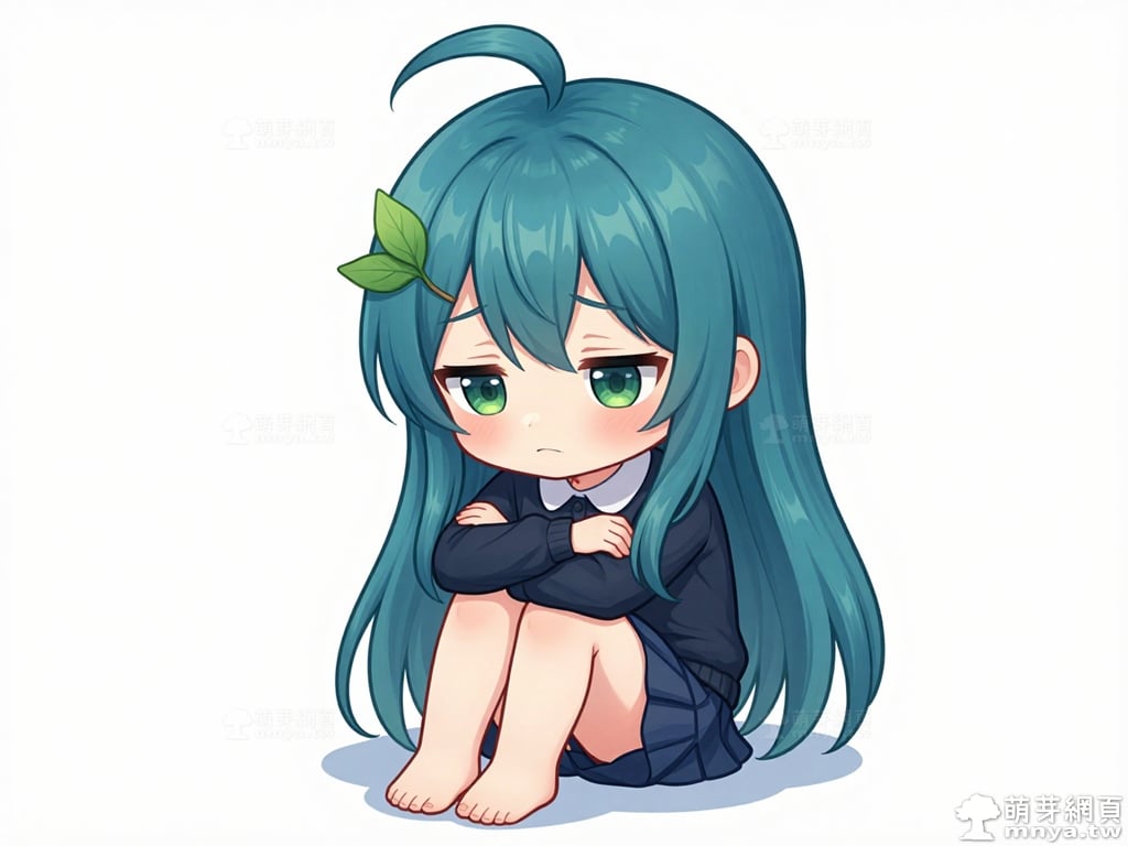 masterpiece, high quality, anime, (chibi:2), (white background:2), (full body shot:2), (mnya_niang_z:1.5), long hair, blue hair, leaf hair ornament, leaf, ahoge, bangs, hair between eyes, green eyes, long sleeves, black sweater, cardigan, collared shirt, white shirt, shirt, blue skirt, pleated skirt, skirt, sad. <lora:mnya_niang_z_000001800>
