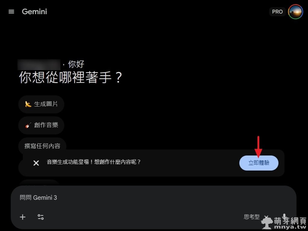▲ 進入 Gemini 介面後,系統會主動跳出「音樂生成功能登場」的全新提示。這標誌著 Lyria 3 模型正式整合進對話流程中。點擊醒目的「立即體驗」按鈕,即可開啟音樂創作功能,讓使用者能從文字或圖片出發,探索無限的旋律可能性。