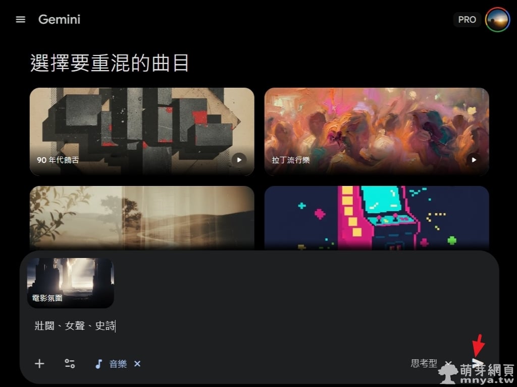▲ 在生成介面中,系統提供了多種曲風模組供使用者參考。在此範例中,我選擇了「電影氛圍」模板,並自行輸入了「壯闊、女聲、史詩」等核心關鍵字。這種直覺的操作方式,讓即便不具備樂理基礎的使用者,也能清晰定義出想要的音樂情緒。點右下角紙飛機圖示送出指令。