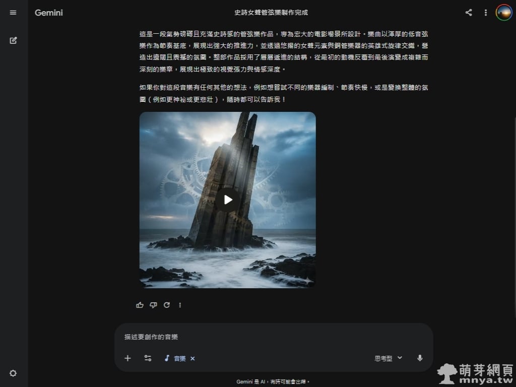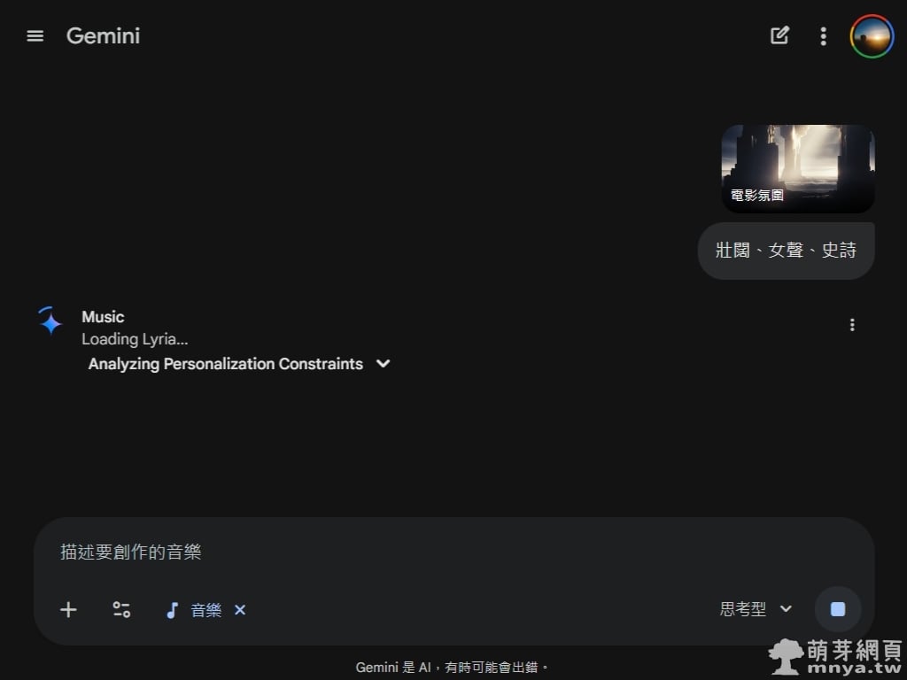 ▲ 送出需求後,Gemini 會進入運算狀態,畫面上會顯示「Loading Lyria...」以及正在分析個人化約束條件的進度。這段過程展現了 AI 正在後端快速媒合樂器編制、調性與使用者提供的關鍵字,確保生成的每一秒音軌都符合「史詩感」的設定。