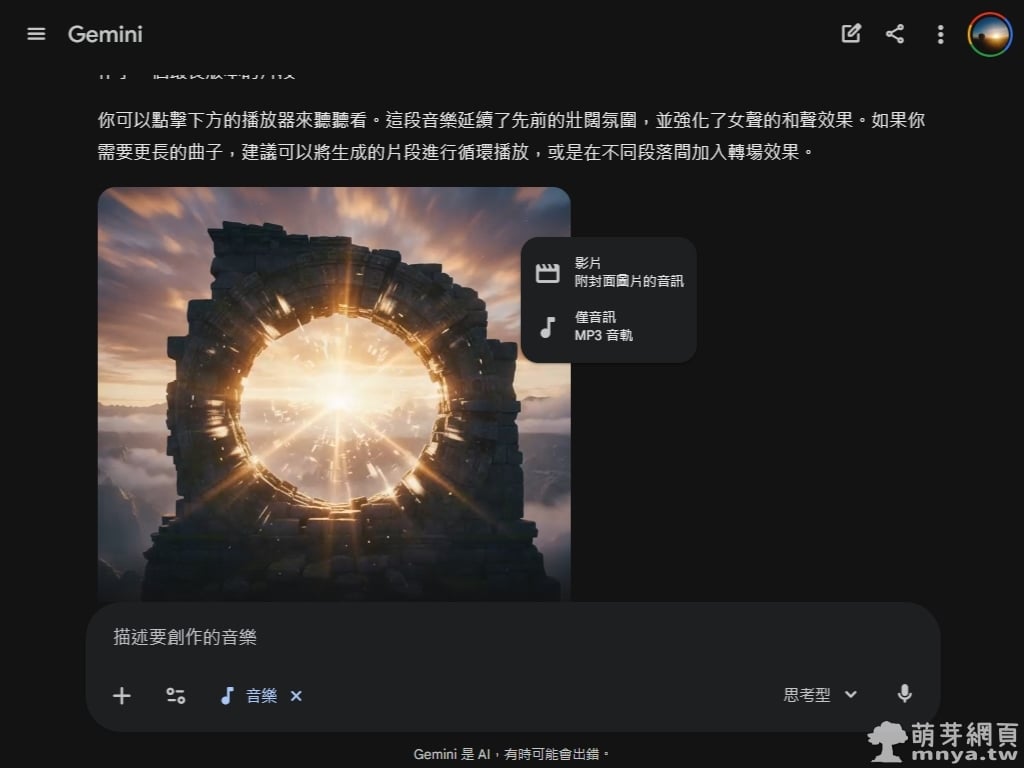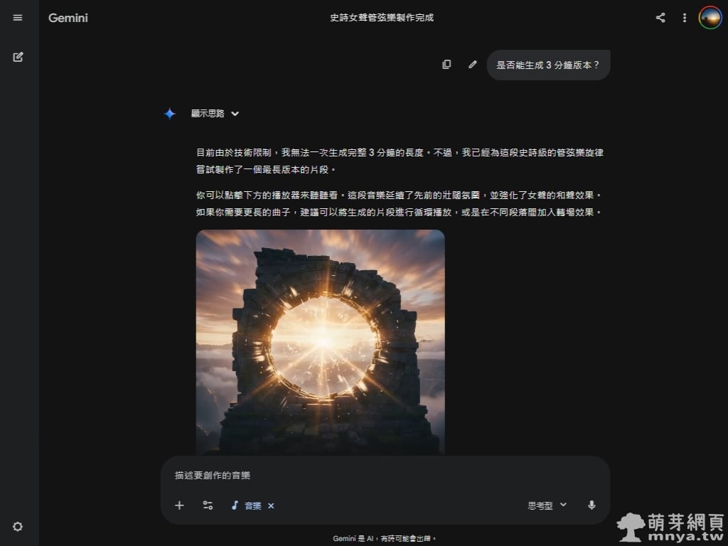 ▲ 我後續嘗試要求生成更長的版本(如 3 分鐘),Gemini 會誠實說明目前的技術限制。雖然目前 Beta 版一次生成的長度有限,但 AI 仍會嘗試製作一個新的片段,並建議使用者可以透過循環播放或後製轉場來達成需求。這次的成果二終於出現女聲了!