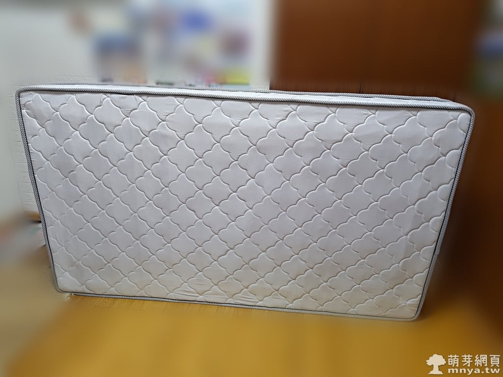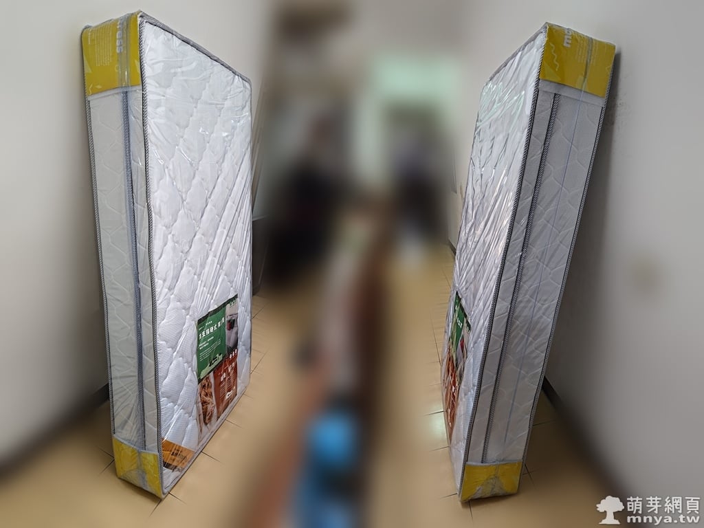 ▲ 這是床墊送達家中時在走道上的模樣,可以看到直立式的單人加大床墊外層包裹著厚實的塑膠保護包裝,確保在運送與搬運過程中不會沾染環境髒污。從側切面可以觀察到整張床墊具有相當厚實的紮實感,這種多層次的結構包含了舒適棉、乳膠與彈簧,預示著接下來將會有的絕佳承托表現與耐用度。