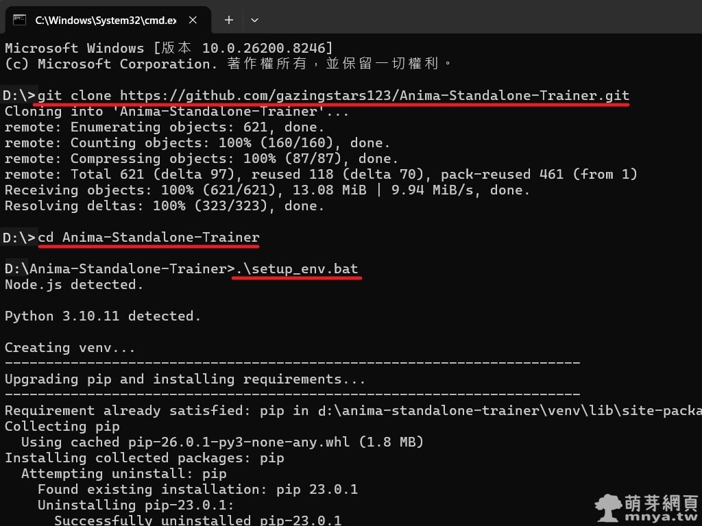 ▲ 首先開啟命令提示字元(CMD),先到想放此工具的路徑下,使用 Git 指令將專案儲存庫複製到本地硬碟中(git clone https://github.com/gazingstars123/Anima-Standalone-Trainer.git),並進入目錄(cd Anima-Standalone-Trainer)執行 setup_env.bat。此批次檔會自動偵測系統中的 Node.js 與 Python 3.10+ 環境(請事先安裝這些軟體),接著開始建立專屬的虛擬環境(venv)並升級 pip,這是建置穩定訓練環境的第一步。