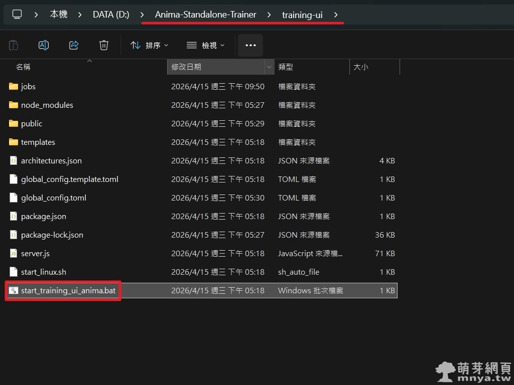 ▲ 環境初始化完成後,透過檔案總管進入 Anima-Standalone-Trainer\training-ui 資料夾。這裡存放了網頁介面的核心組件,我們接下來要執行的是紅框標示的 start_training_ui_anima.bat,它負責啟動基於 Node.js 的後端伺服器以及 Python 訓練核心。