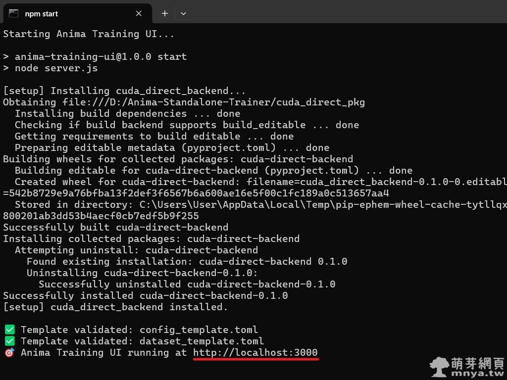 ▲ 執行啟動批次檔後,系統會自動編譯並安裝 cuda_direct_backend 等高效能運算組件。當視窗最後出現「Anima Training UI running at http://localhost:3000」的訊息時,代表伺服器已成功啟動,將會自動開啟瀏覽器。