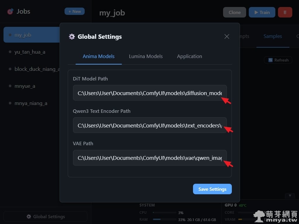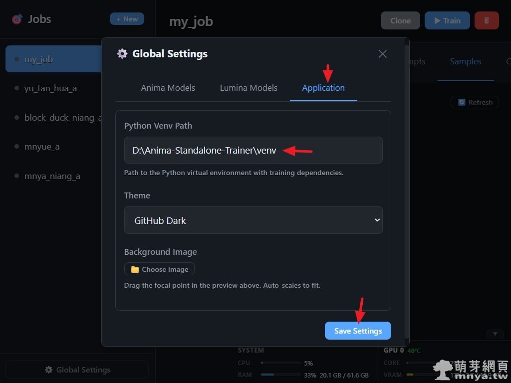 ▲ 最後切換到「Application」分頁,在「Python Venv Path」欄位填入先前建立的虛擬環境路徑(本範例為 D:\Anima-Standalone-Trainer\venv)。確保路徑無誤後點擊「Save Settings」,如此便完成了所有訓練前的環境配置工作。