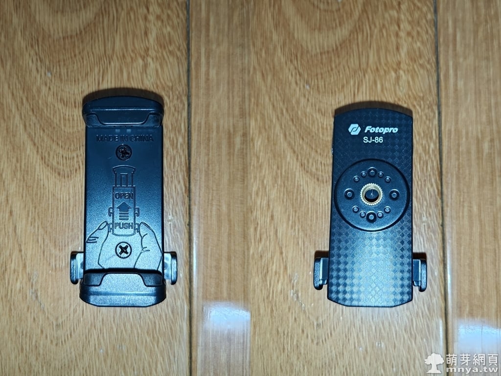 ▲ 這是隨附的 SJ-86 手機夾特寫,其背面與正面都經過精心的設計。夾具背面有清楚的箭頭指示開啟與按壓方向,讓使用者能夠快速安裝手機。而正面則配置了標準的螺絲孔位,可以輕易與腳架上的雲台結合。夾具表面帶有防滑紋路,能確保手機在固定時更加穩妥。