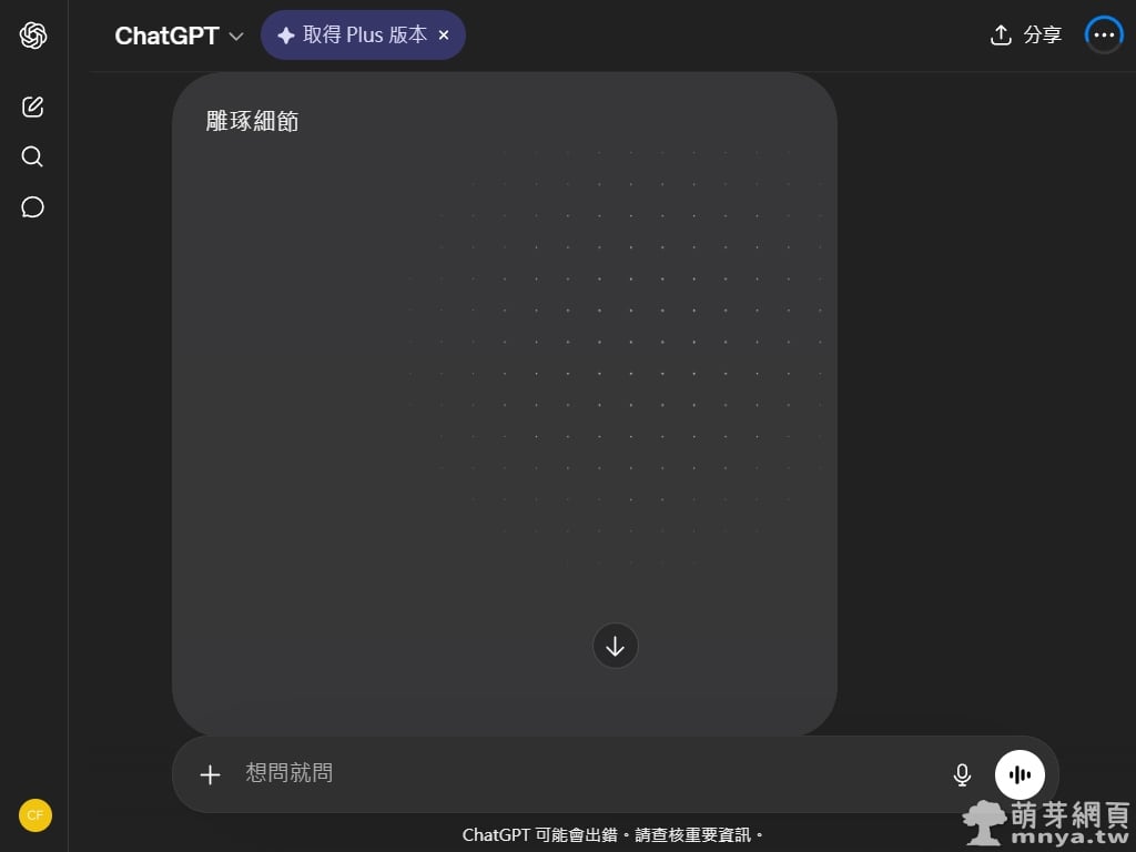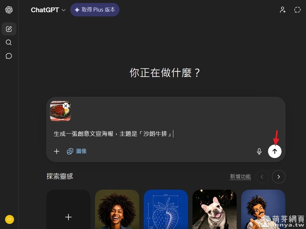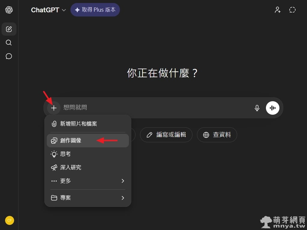 ▲ 在 ChatGPT 的全新介面中,用戶點擊輸入框旁的「+」按鈕,即可從選單中選取「創作圖像」功能。