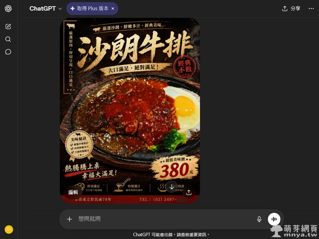 ▲ 隨後,系統在對話中呈現成果。可以看到「沙朗牛排」四個大字字體蒼勁有力,促銷價格與特徵點描述排版整齊,完全解決了過往 AI 難以精確處理中文字體的問題,其成品已具備極高的廣告文宣完稿水準。
