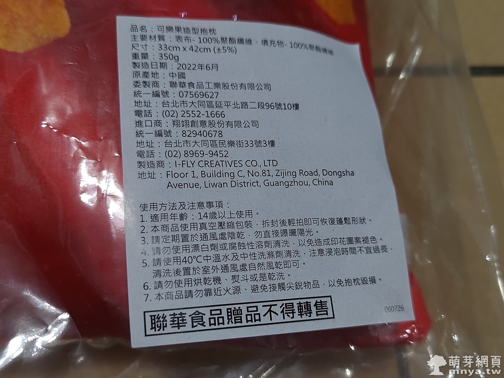 ▲ 包裝背面貼有詳細的產品規格標籤,清楚標示出這款抱枕尺寸約為 33 x 42 公分,重量約 350 公克。標籤上還貼心地附上保養建議,像是建議放置於陰涼通風處以維持圖案色澤,更重要的是下方印有非賣品的字樣,彰顯了這份禮物的特殊意義。