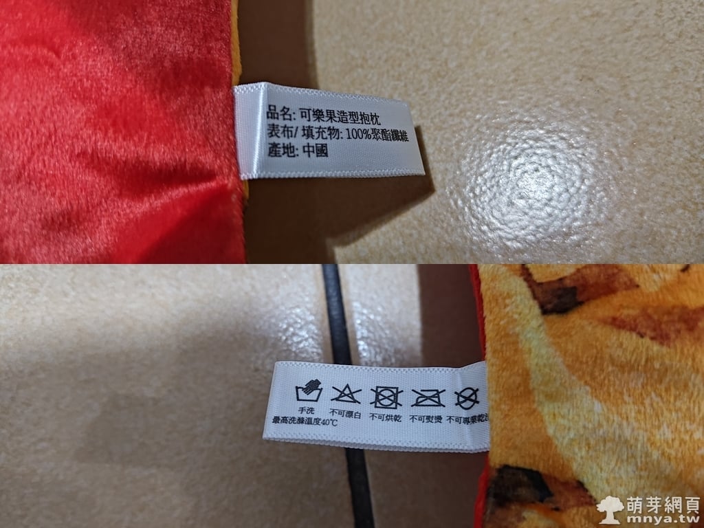 ▲ 抱枕側邊縫製了柔軟的洗滌標籤,標示著成分為百分之百聚酯纖維。清潔方面需要特別留意,建議使用 40 度以下的中溫水進行手洗,且不可使用漂白劑、烘乾機或是熨斗加熱,以維持表布的纖維彈性與圖案清晰度。