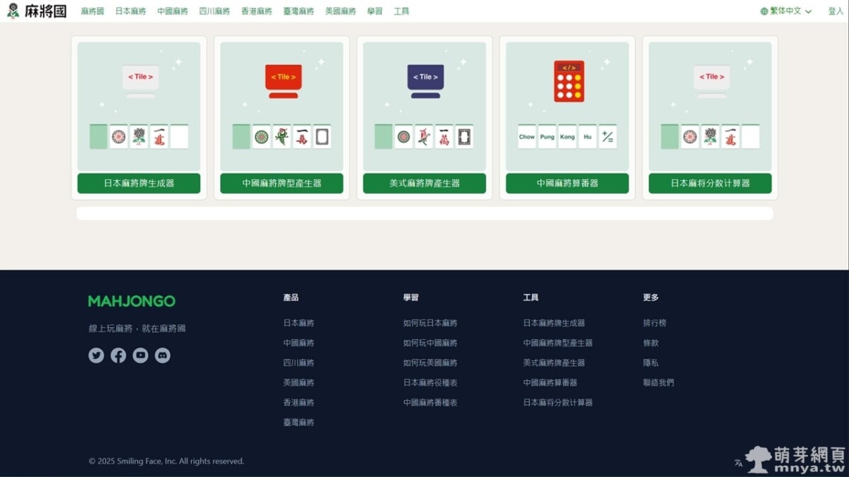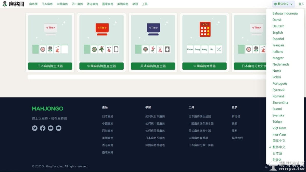 ▲ 網站支援多國語言,從東南亞到歐洲、美洲、日本、韓國都能輕鬆切換語系。無論你來自哪個國家,都能體驗道地麻將樂趣,跨國切磋牌技超方便!官方網站底部可以找到各種社群連結、教學資源及工具整理,產品說明清楚。