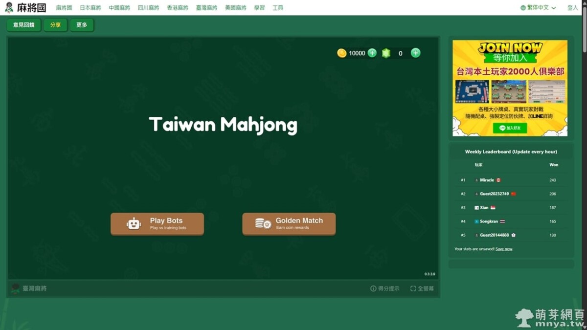 ▲ 以台灣麻將為例,進入房間後可以選擇跟 AI 機器人練習(Play Bots),或參加隨機真人配對有獎賽(Golden Match)。右側還有排行榜與最新活動,高手名單每小時更新,競爭感十足!