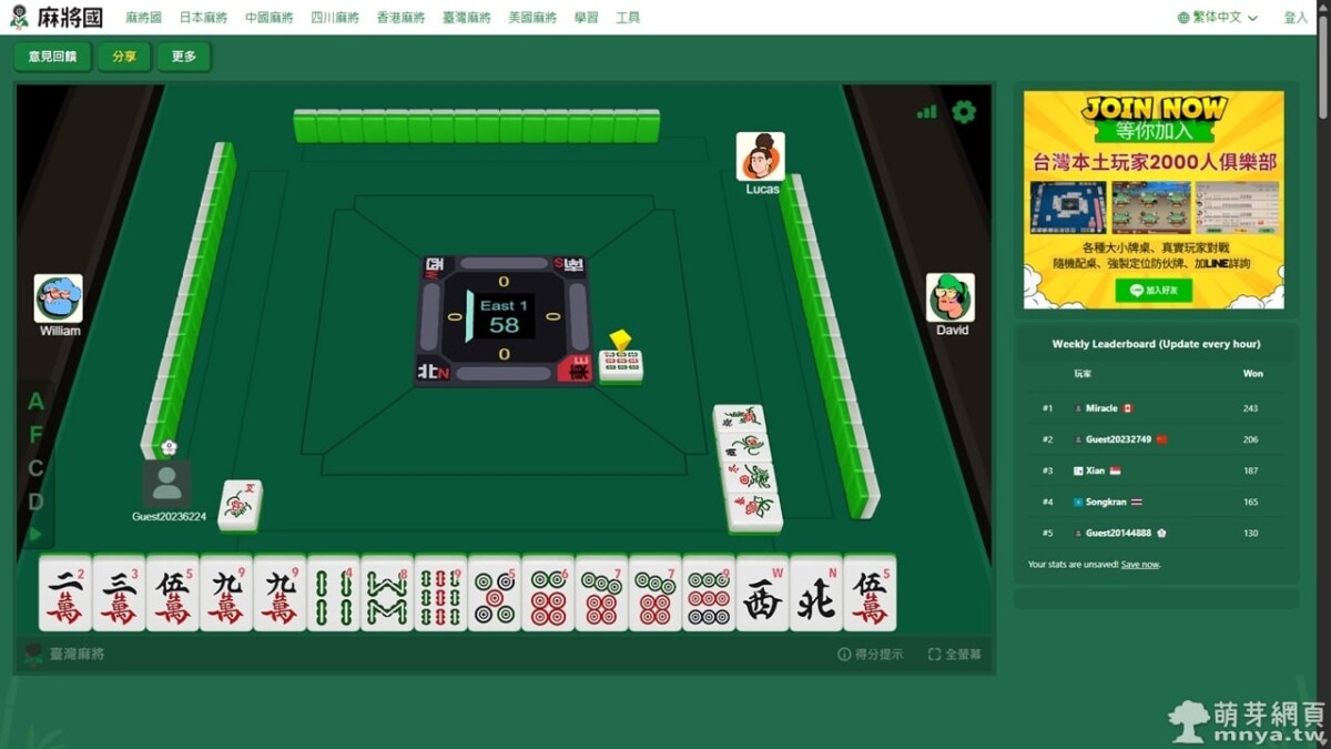 你是不是也常常想打麻將,卻苦於沒三缺一(也就是三個人還差一個)、又不想安裝複雜的程式或 App?現在推薦一個超方便、免安裝軟體,直接用瀏覽器就能開桌的線上麻將網站——麻將國!不論你用電腦還是手機,只要有網路,開啟瀏覽器就能馬上跟世界各地的玩家同樂。對於新手來說還有得分提示工具,不怕規則不熟,老手也能過癮切磋牌技。網站還內建麻將製圖、算分器等工具,支援 20 多國語言,輕鬆跨國交流,隨時隨地都能開戰!