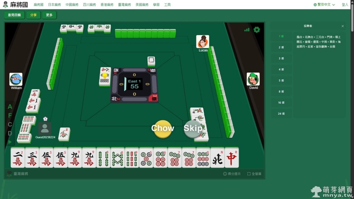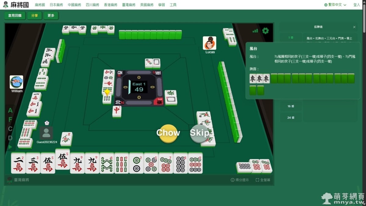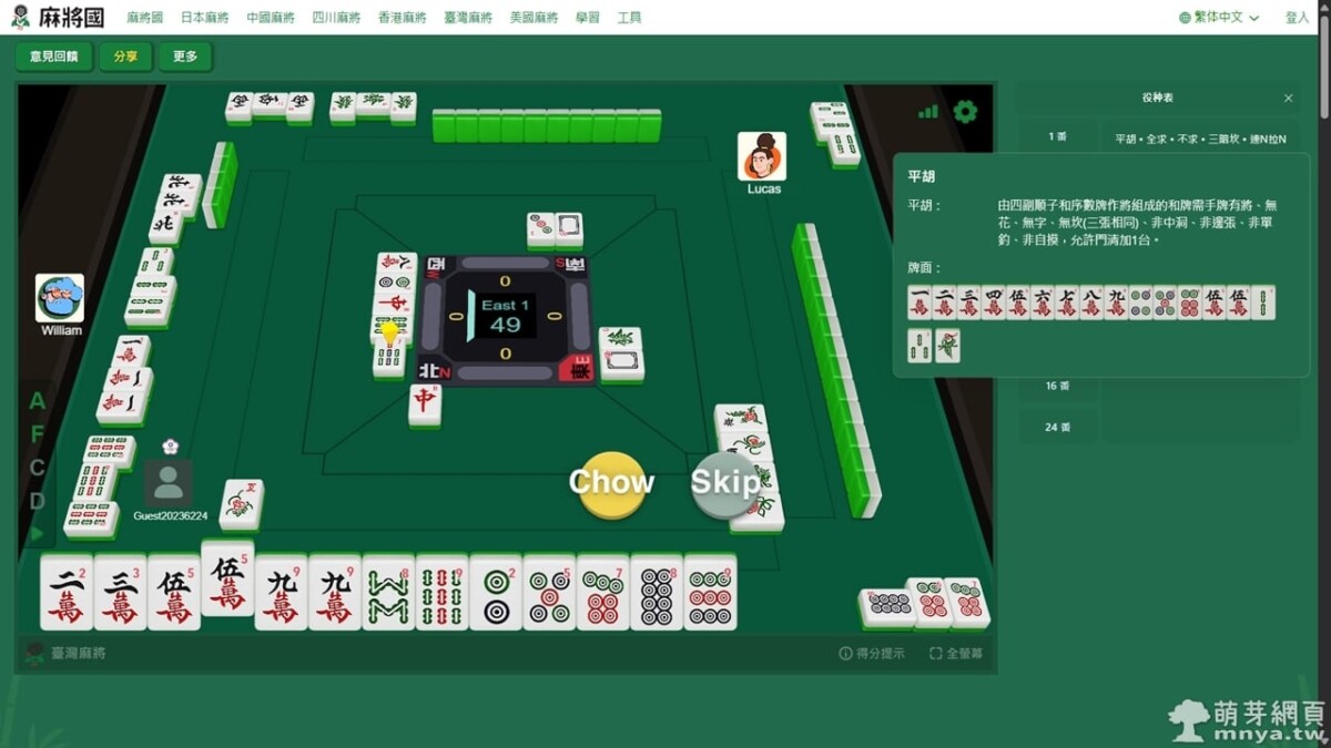 ▲ 遇到可以吃牌、碰牌等時,系統會自動彈出選項按鈕(Chow/Skip),完全圖形化介面,就算沒經驗也不怕出錯。點擊下方「得分提示」後右側會顯示役種表。舉例來說,「1台」或「1番」的意思是這些牌型每出現一種,就能加一台,直接影響你胡牌時的分數計算。