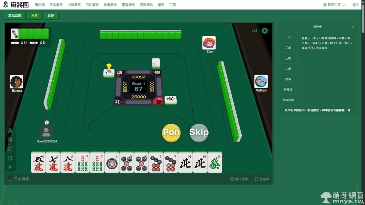 ▲ 除了台麻,網站還有日本麻將。畫面同樣清爽,也一樣有提供各種番型說明,完全不用自己慢慢查表!